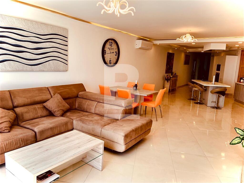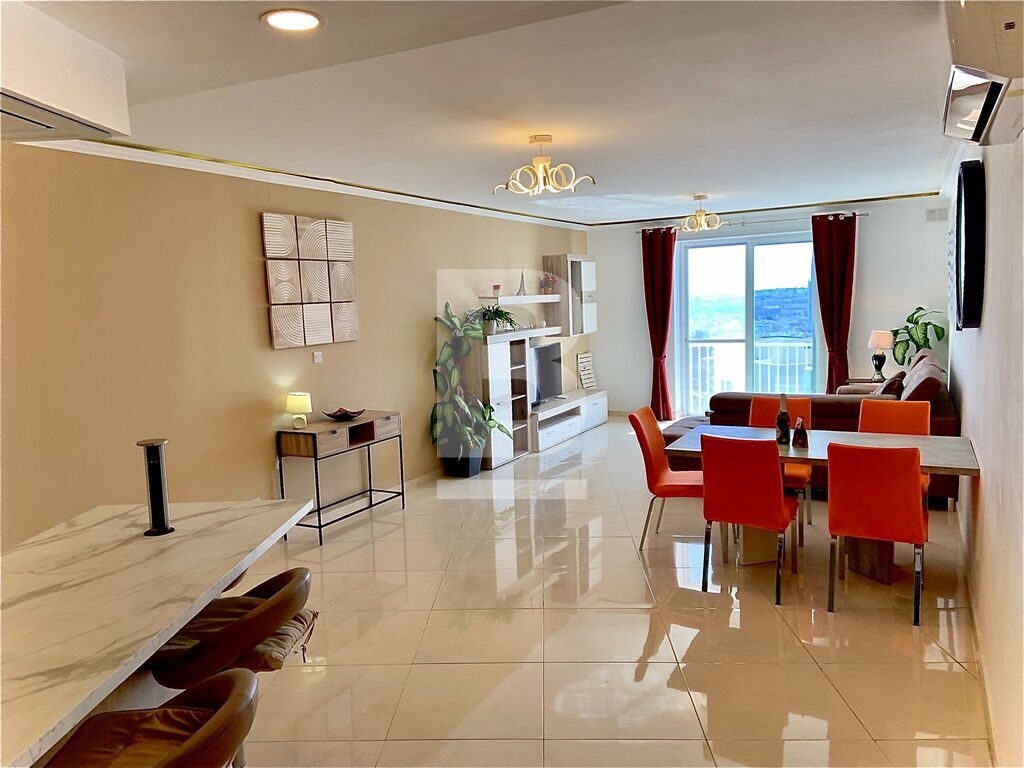 Bright and spacious fifth-floor apartment situated in a quiet residential area of Kappara and within walking distance to most amenities. The property comprises an open plan kitchen/ living/ dining area leading to a balcony enjoying open views, three double bedrooms ( main with en-suite shower room ) main bathroom, a laundry area, and a back balcony. This property is fully air-conditioned and includes TV, washing machine, lift and intercom.