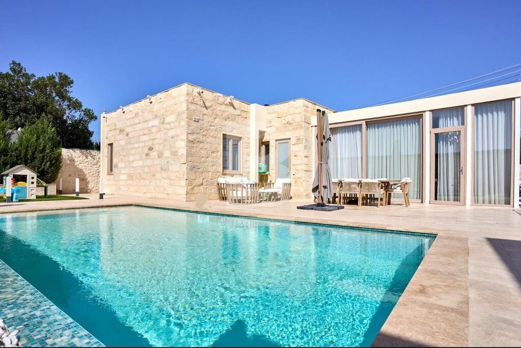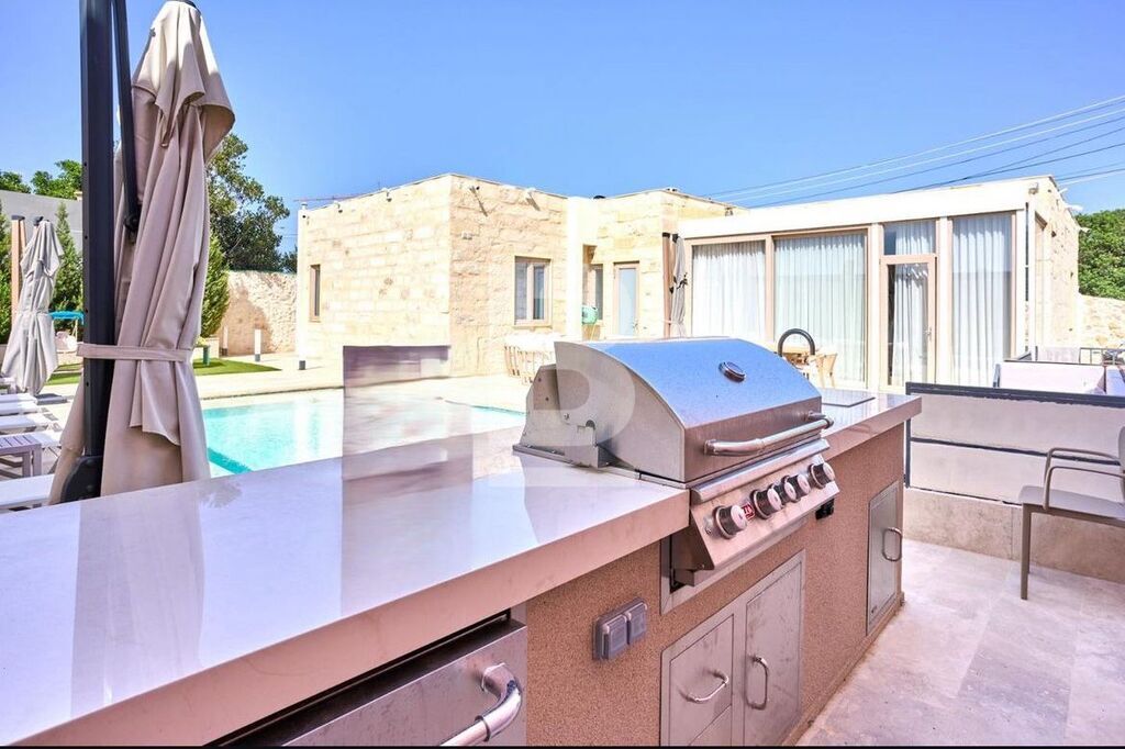 This newly constructed, exquisitely designed property is situated in a peaceful ODZ area surrounded by lush greenery on the outskirts of Rabat, yet only a short drive from essential amenities. This charmingly converted bungalow sits on a plot of nearly 600sqm, with approximately 400sqm of outdoor space. Upon entering through the main gate, you'll find a front driveway with space for four cars, alongside a large swimming pool, and an impressive entertainment area complete with a kids' play zone, barbecue, lounge, and outdoor bar. The property has been finished to an exceptional standard, with great attention paid to features such as apertures, soundproofing, and high-quality internal fixtures. The interior spans two levels. On the ground floor, there's an inviting open-plan kitchen, living, and dining area, along with three bedrooms, each with its own ensuite, including a master bedroom with a walk-in wardrobe, a guest toilet, and a spacious internal courtyard. The lower level offers a generous cinema room and an additional large room, ideal for use as a gym, study, or nanny's quarters. This beautifully furnished home seamlessly blends modern touches with traditional features, making it the perfect choice for those seeking serene surroundings. Contact your agent for a viewing today.