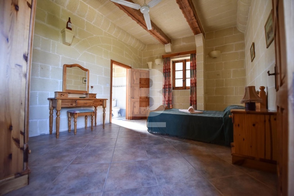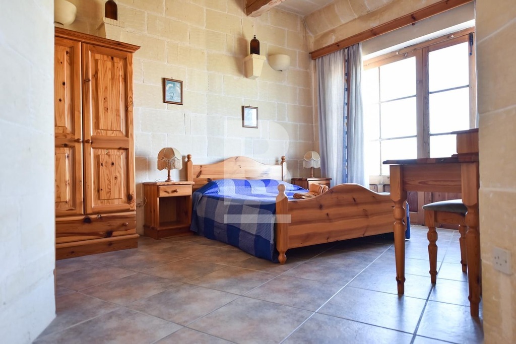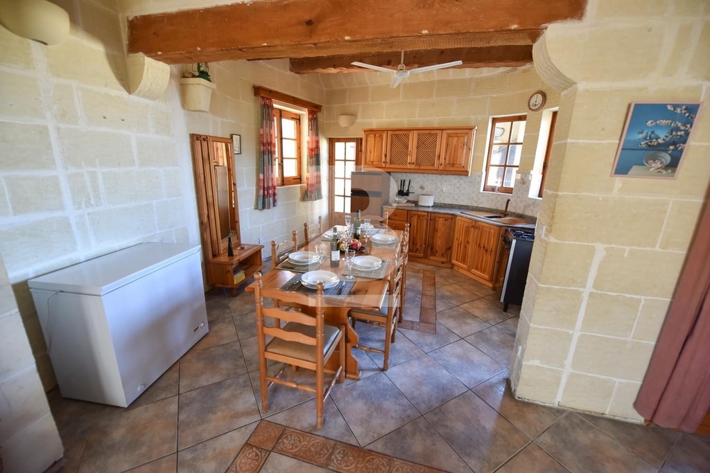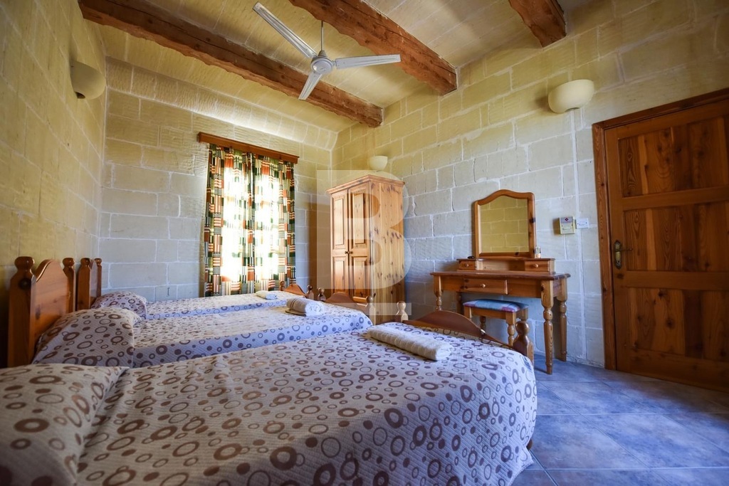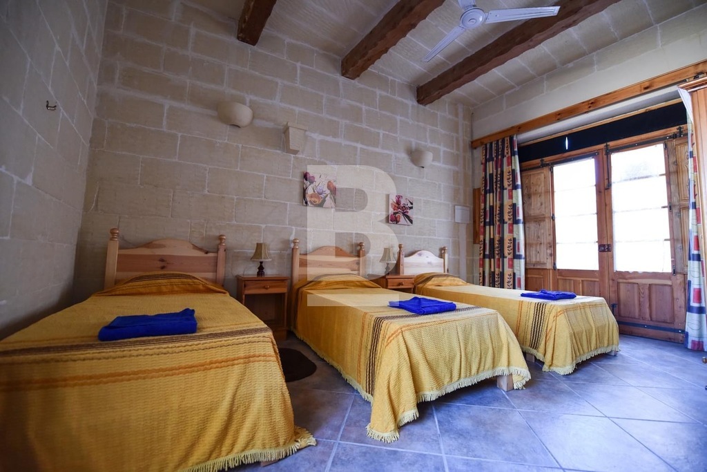 This stunning, fully furnished house of character in Xaghra offers comfortable living just a short walk from a local food shop. A spacious hallway leads to five bedrooms, including four double en-suite rooms and one with two single beds. The master bedroom features a large bed, while two other rooms with twin beds offer flexibility and comfort. All bedrooms are air-conditioned and boast beautiful views. The expansive kitchen, dining, and living area is filled with natural light and opens onto a front terrace with breathtaking countryside and pool views. The kitchen is fully equipped with everyday appliances, including a cooker, fridge, and handy kitchen gadgets. Combining countryside charm with modern conveniences, this air-conditioned property is ideally located for peaceful living while remaining at the heart of Gozo.