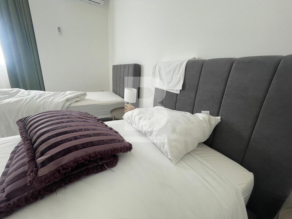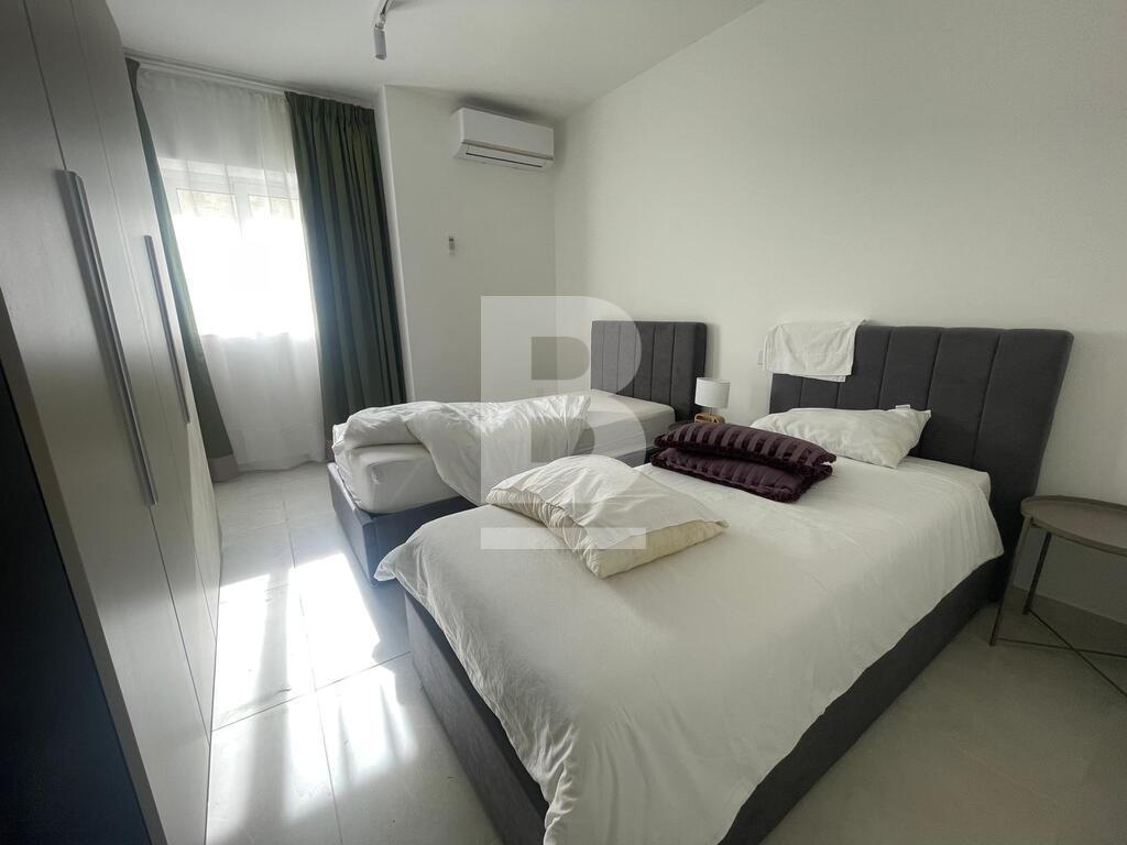 On the top floor, there is another two-bedroom apartment. This unit includes a master bedroom with an en-suite bathroom and a second room with two single beds. The open-plan kitchen, dining, and living area lead to a generous terrace with partial sea views, perfect for relaxing or entertaining.