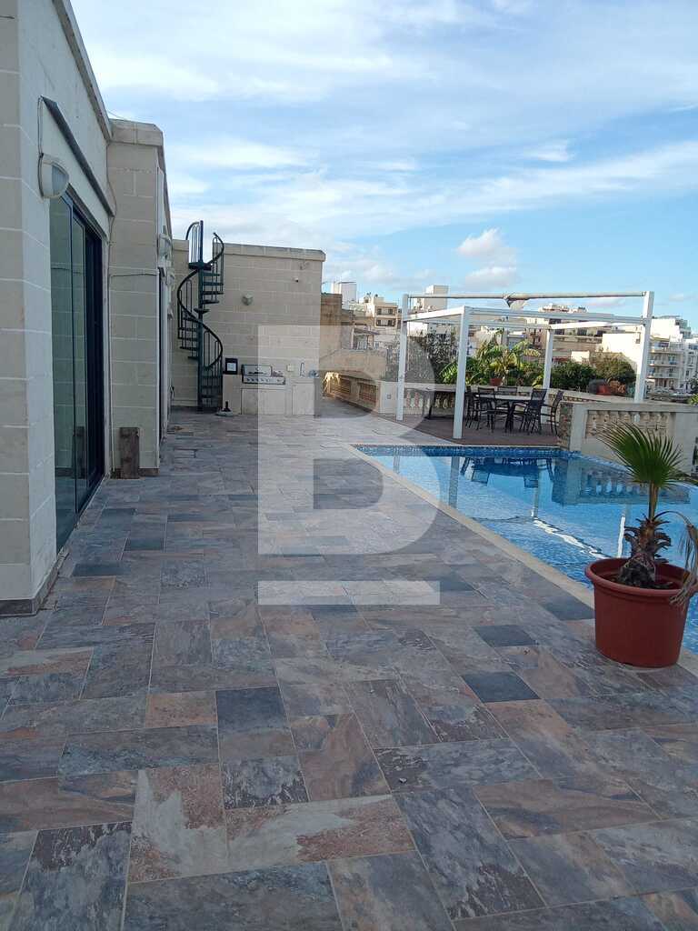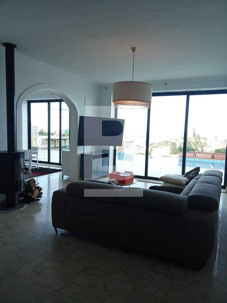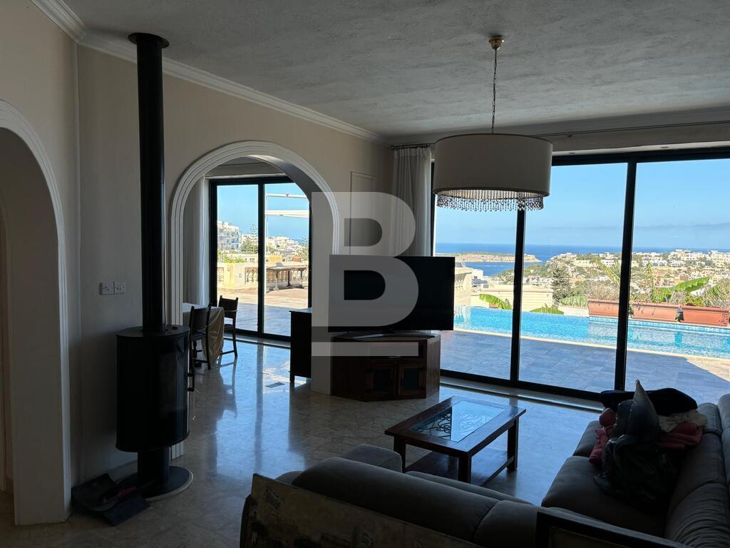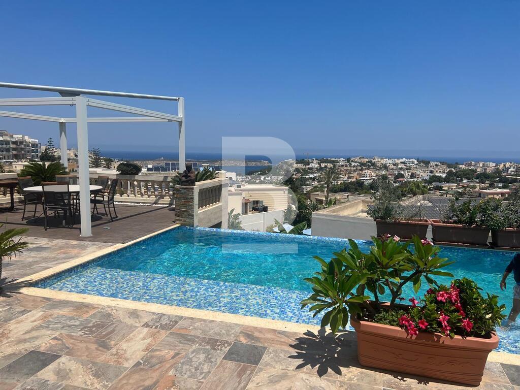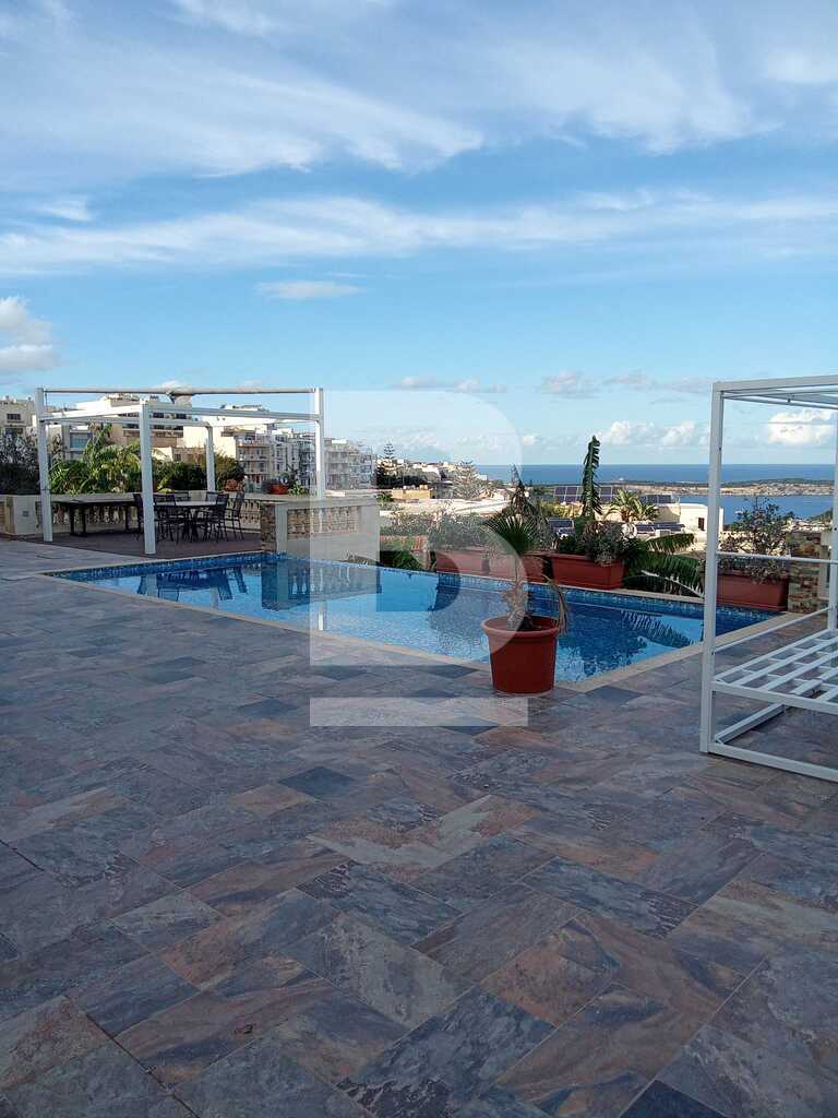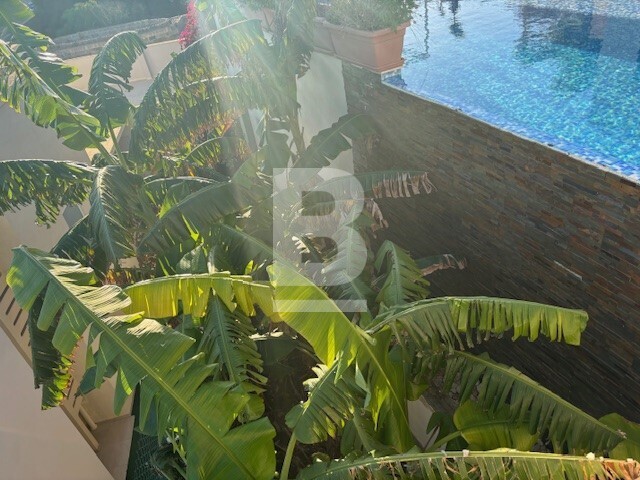 This stunning fully detached villa, situated on a 1200sqm plot in the prestigious Santa Maria Estate, boasts breathtaking sea views from the pool area, living spaces, and bedrooms. The upper level features a spacious open-plan kitchen, living, and dining area, three bedrooms, an office, a laundry room, and three bathrooms, all fully air-conditioned for ultimate comfort. The lower level includes staff quarters with a bedroom, a combined kitchen/living/dining area, a bathroom, and a storage room, providing additional flexibility. Outdoor amenities include an infinity pool with a large deck area, an outdoor kitchen, and a beautifully landscaped garden with mature trees, offering the perfect setting for relaxation and entertaining. The property also includes a garden storage room, a generous driveway, and a two-car lock-up garage with remote-controlled access. This lovely villa combines comfortable living with practical features, making it an ideal home for those seeking comfort, relaxation, space, and stunning views.