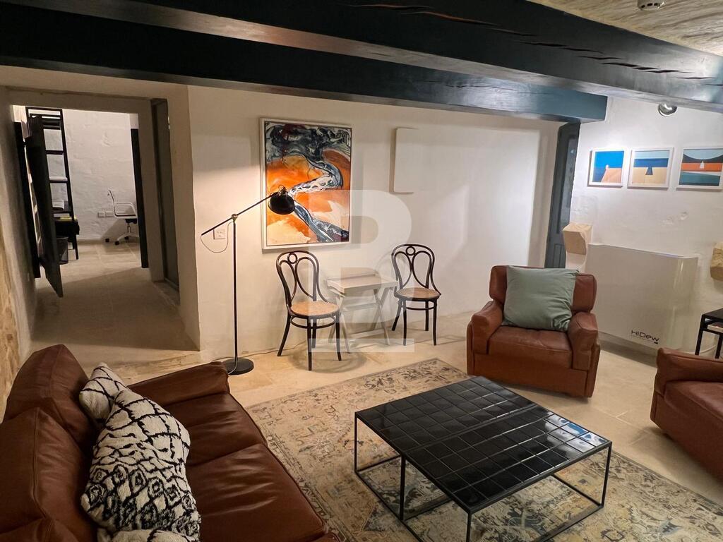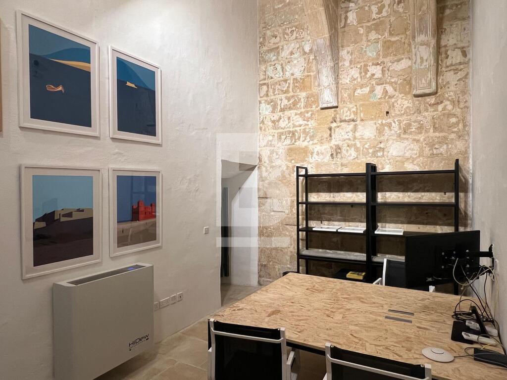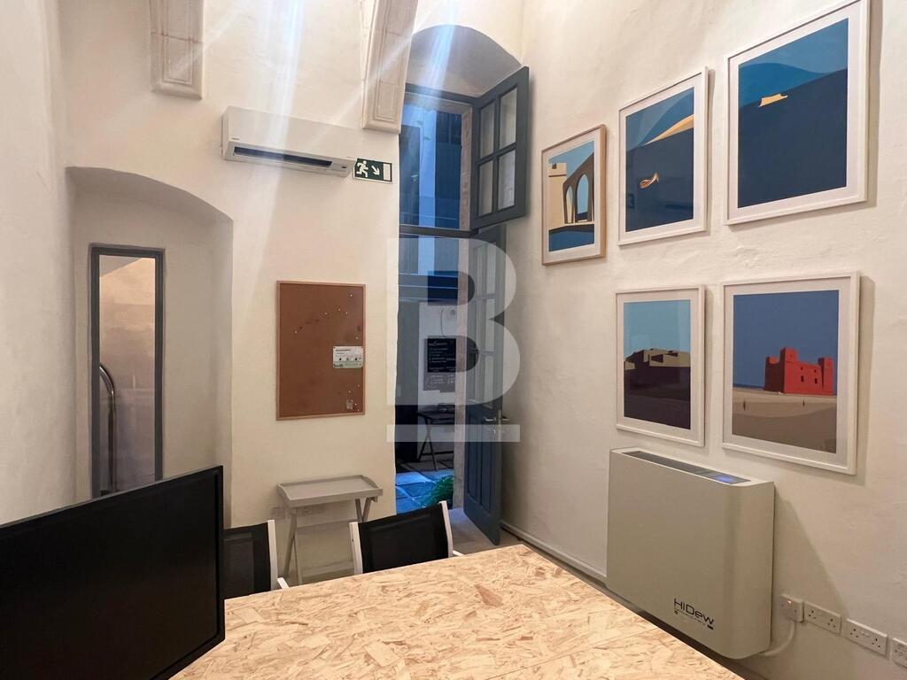 A beautiful and creatively designed ground-floor office in the heart of Valletta making it a lovely working environment. Comprising a welcoming entrance, leading to an internal courtyard, A fully equipped kitchen, an equipped office , a cosy living room with tv / 2nd working space . A bathroom. Ac throughout . A must see!