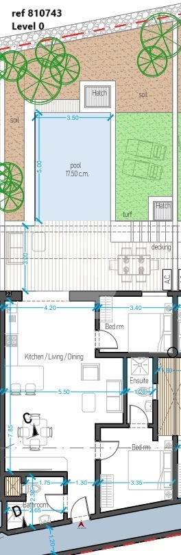 Apartment measures 81.61sqm interior and 95.64sqm exterior including a pool, an open plan kitchen/living/dining, two bedrooms, bathroom and en-suite.