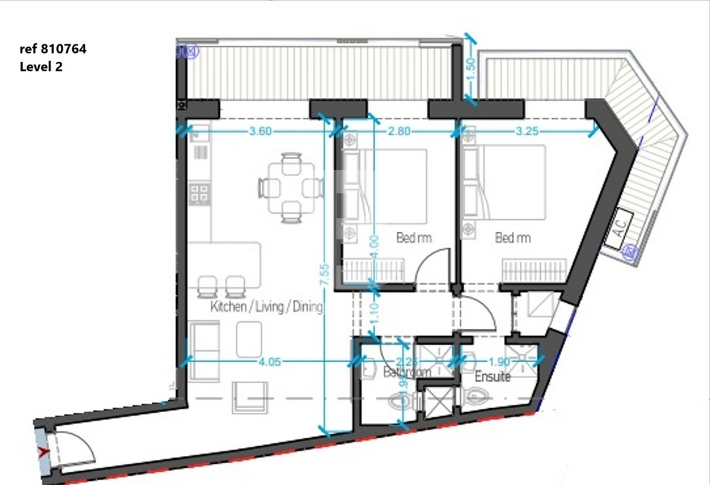 Apartment measures 85.37sqm interior and 19.60sqm exterior, an open plan kitchen/living/dining, two bedrooms, bathroom and en-suite, and a front terrace.