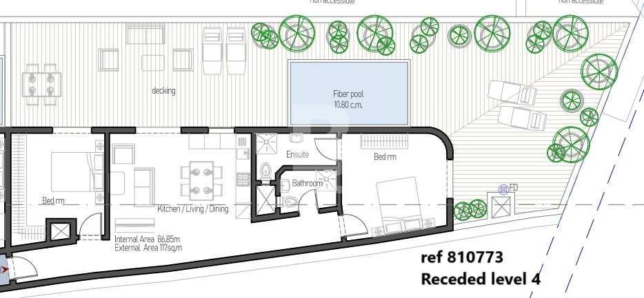 Penthouse measures 86.85sqm interior and 117.19sqm exterior including a side and back terrace with a fibre pool, an open plan kitchen/living/dining, two bedrooms, en-suite and a bathroom.