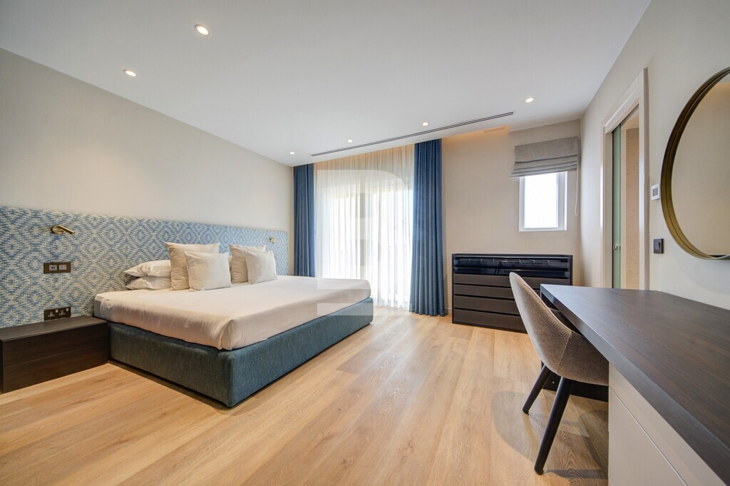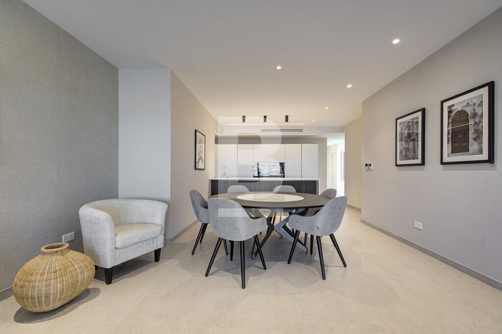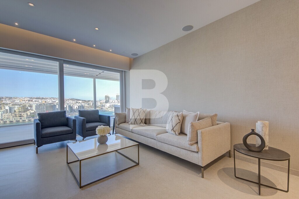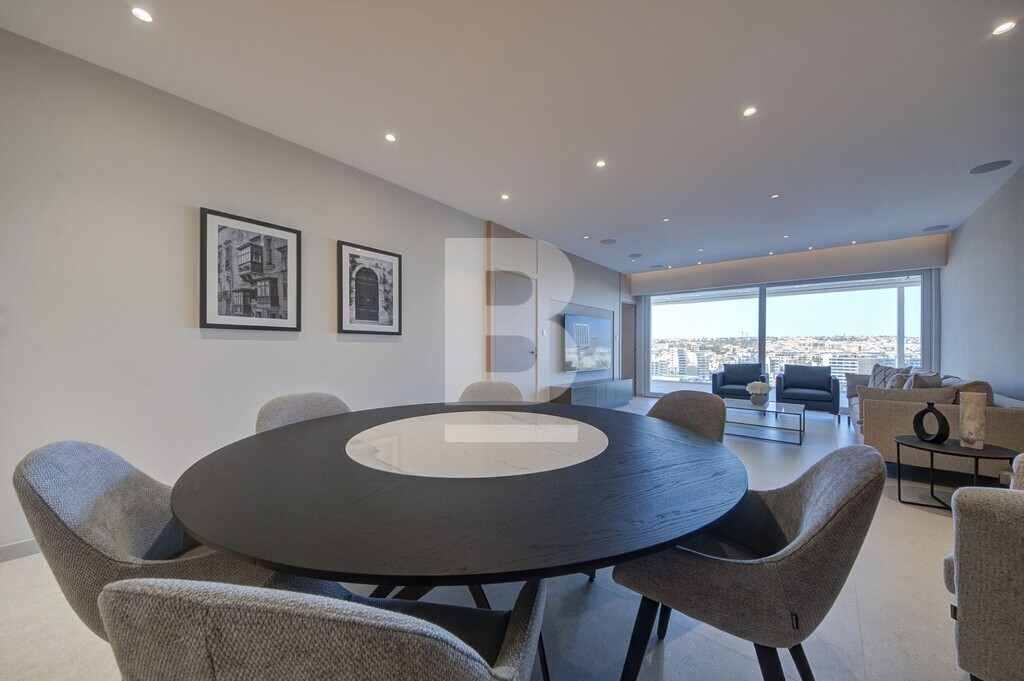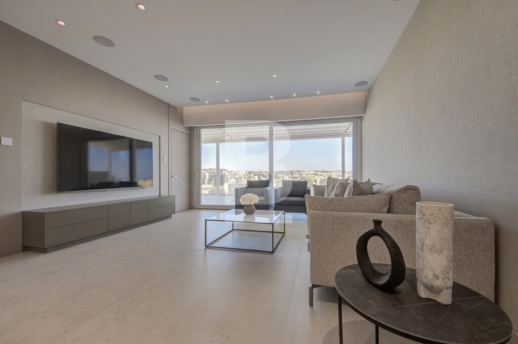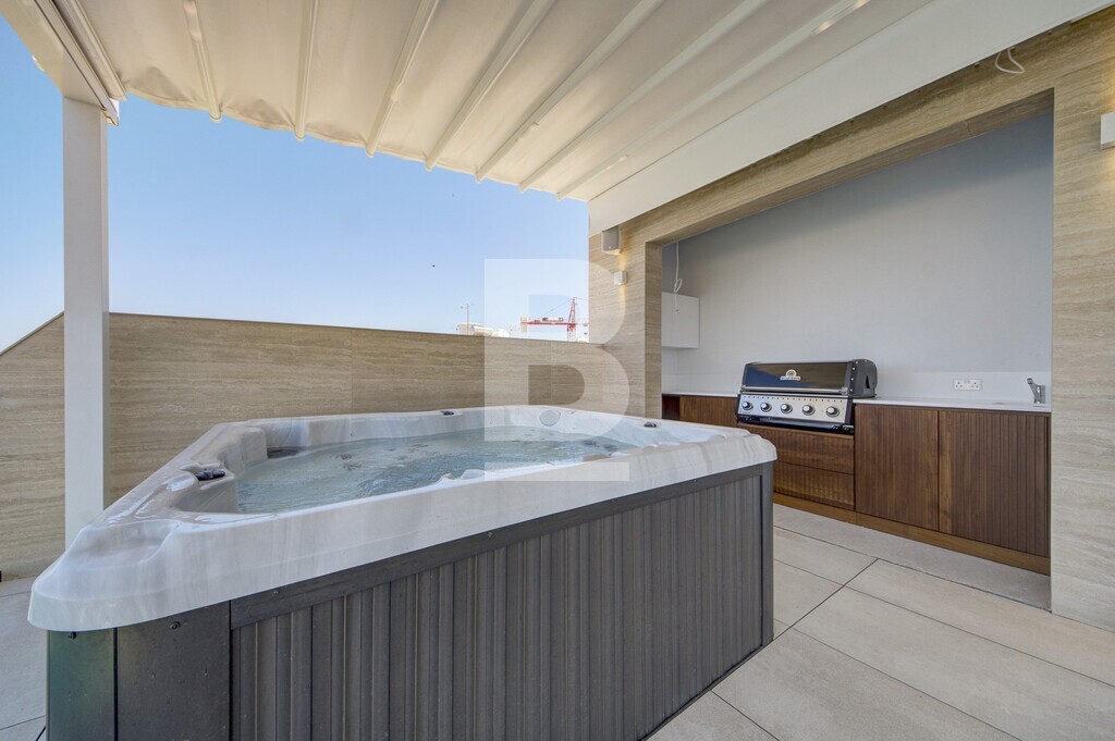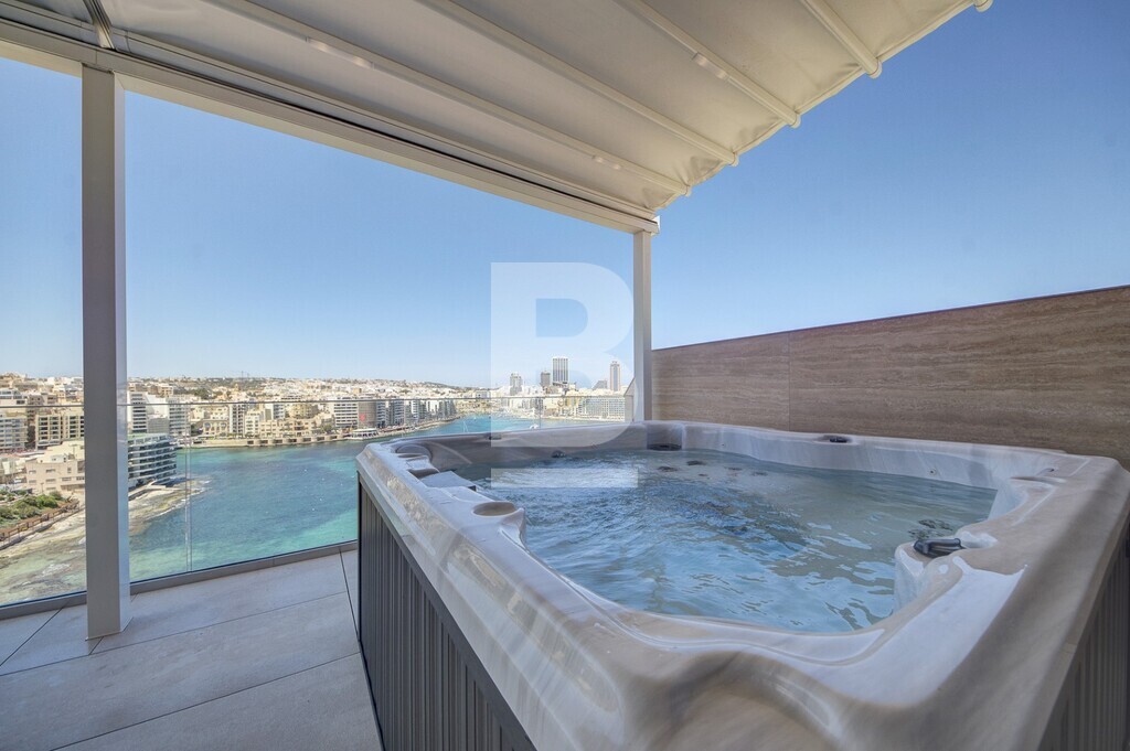 A luxurious 3-bedroom penthouse offering a stylish and comfortable living experience with a total internal area of 157 sq meters and an outdoor area of 131 sq meters.The master bedroom features an ensuite bathroom with a walk-in shower, while both the second and third bedrooms boast their own ensuite bathrooms, each with a walk-in shower. 3rd bedroom can also turn into a study/office. The fully fitted kitchen comes equipped with high-end SMEG appliances, including a full fridge and freezer, dishwasher, hob with aspirator, a microwave and a reverse osmosis water maker. Also including a laundry room and cloak room. The spacious dining area includes an elegant table with 8 chairs perfect for hosting guests and a living room with a 75” TV and a 3-seater sofa and 3 armchairs with intelligent lighting and a surround sound system, electric curtains and concealed LED soffit lighting. Fully air-conditioned and double glazing glass. The terrace offers spectacular views of St Julian’s and is complete with a retractable canopy, jacuzzi tub, and a jacuzzi bar featuring a built-in barbecue, ice maker, fridge, storage and sound system. Outdoor dining and lounge areas provide additional spaces to relax and entertain. Optional parking available.