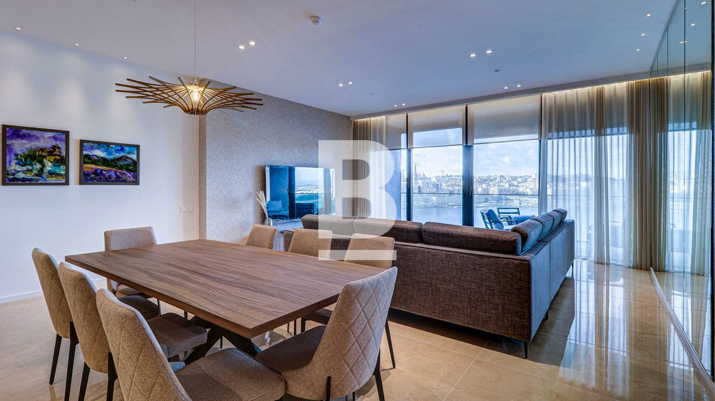 A three-bedroomed Seafront haven consisting of an open plan living and dining area with a modern kitchen and a large south-facing balcony furnished with a double sunbed and dining table and chairs, the full height panoramic doors allows natural light and warmth to pour inside, whilst presenting a breathtaking view of Valletta, three bedrooms all with en-suite bathrooms, 2 of which also have balconies furnished with armchairs and a coffee table, a laundry room and a guest toilet. This apartment includes underfloor heating in the bathrooms, is fully air-conditioned/heated and includes all modern day conveniences. This property comes with use of on-site fitness centre, spa and pool facilities and one may also benefit from other specialised concierge services, range of eateries and a lido all available at special rates. There are variety of shopping outlets and cafés around the area, residents of this Luxury Living Complex will never be at a loss for things to do and enjoy. The complex also comes with 24h reception or security services, providing peace of mind where it matters most. Should one wish, housekeeping services may be arranged quickly and easily, with qualified and trustworthy cleaners. Residents will also benefit from the unique advantage of the bustling Sliema commercial centre right outside their door - with a variety of high street shops, quaint cafes and bars, renowned restaurants, and endless leisure.