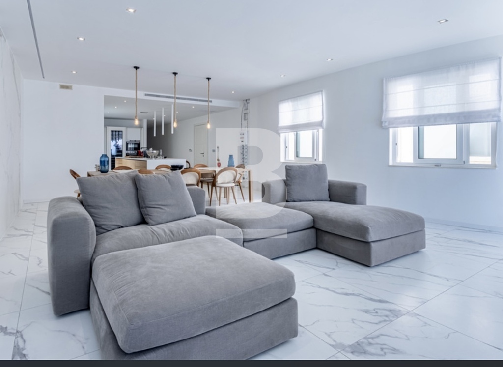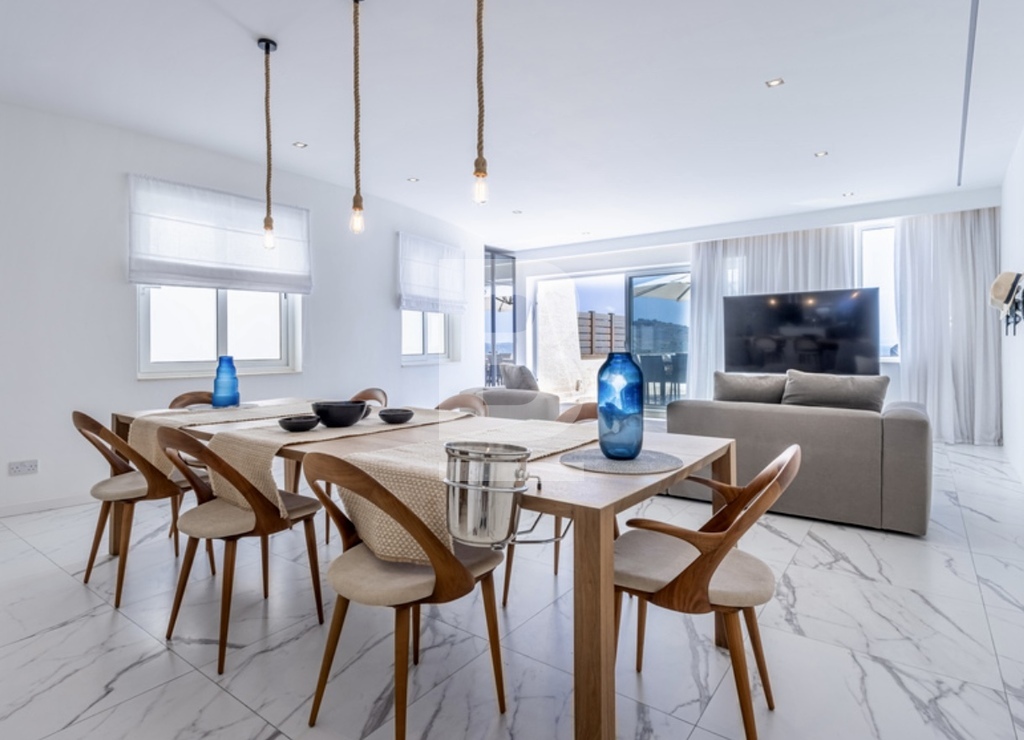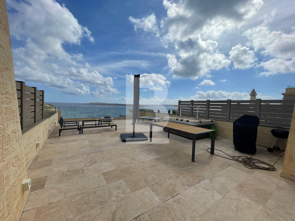 Gozo luxury apartment with breathtaking views of Mgarr Harbour. From the moment you step inside, you’re greeted by a bright and welcoming open-plan kitchen, living, and dining area. The spectacular scenery floods the space with natural light. Step out onto the magnificent 70 sqm terrace, which is perfect for lounging, alfresco dining, entertaining, or simply soaking in the panoramic beauty from the jacuzzi. The terrace seamlessly connects to the designer kitchen, complete with a breakfast bar and premium appliances, offering the ultimate indoor-outdoor living experience. Boasting 200sqm of internal space, this residence features three generous bedrooms, including a luxurious master suite with an en-suite bathroom. The additional bedrooms are served by a stylish family bathroom located conveniently just across the hall. A separate laundry and utility room, as well as 2 interconnecting one-car garages, add further practicality to this exceptional home. Offered freehold, fully designer furnished to the highest standards, and ready to move into, this property is a rare find—ideal for the discerning buyer seeking timeless elegance and modern comfort.