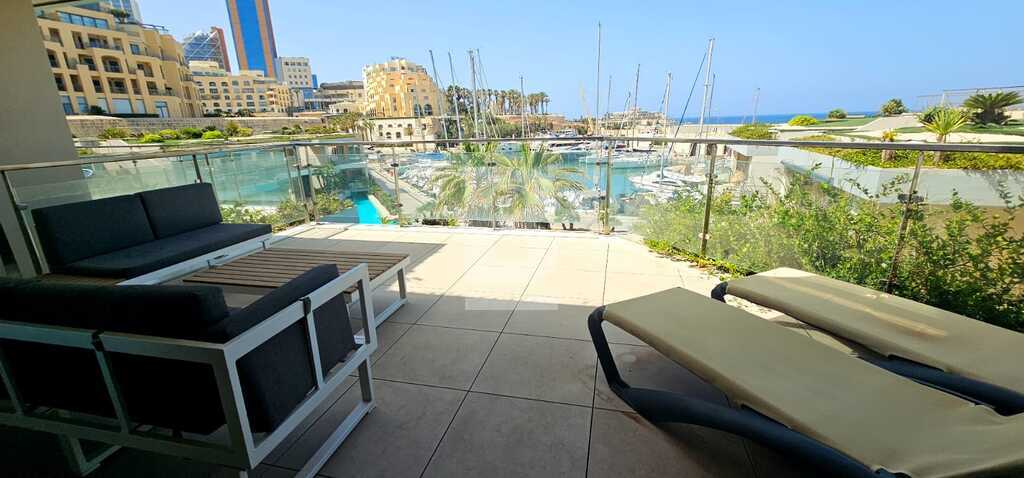 A luxuriously finished and fully furnished, 2 bedroom waterfront apartment having the possibility of being converted into a 3 bedroom apartment, situated in the new and unique Laguna forming part of the award winning prestigeous development in Portomaso. Located on the upper floor, this 175 square meters large unit, enjoys a comfortable layout, you are welcomed by a nice inviting entrance seperating the sleeping quaters from the main living area, that comprise of 1 Master bedroom having it's private walk in wardrobe, additional storage room, en-suite bathroom and balcony, whilst the second bedroom is equipped with a double bed and plenty of storage solutions having it's comfortable private en-suite facilities and small balcony. A large guest bathroom and seperate laundry room are also made available.