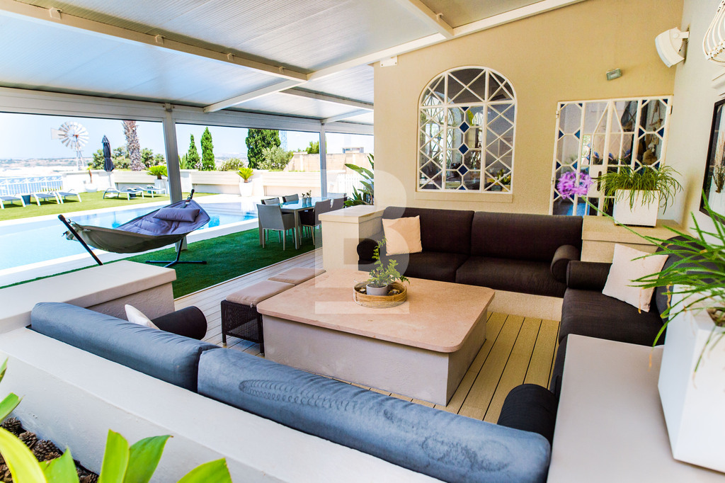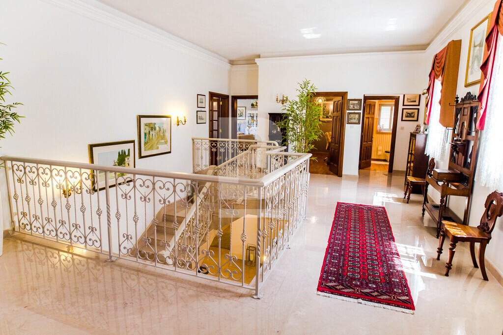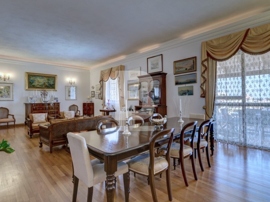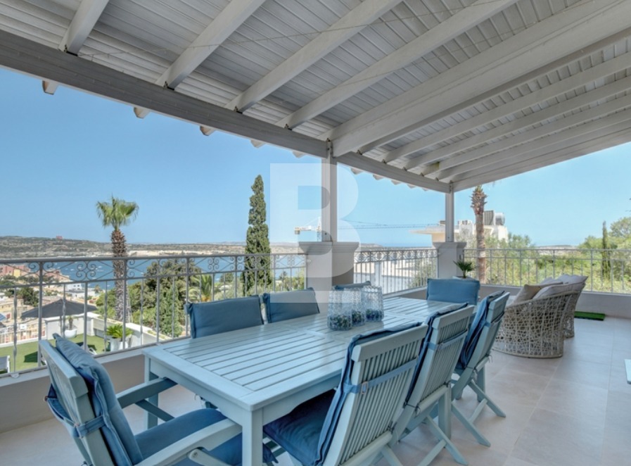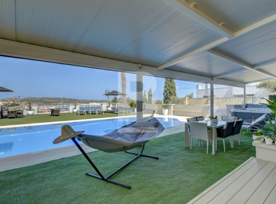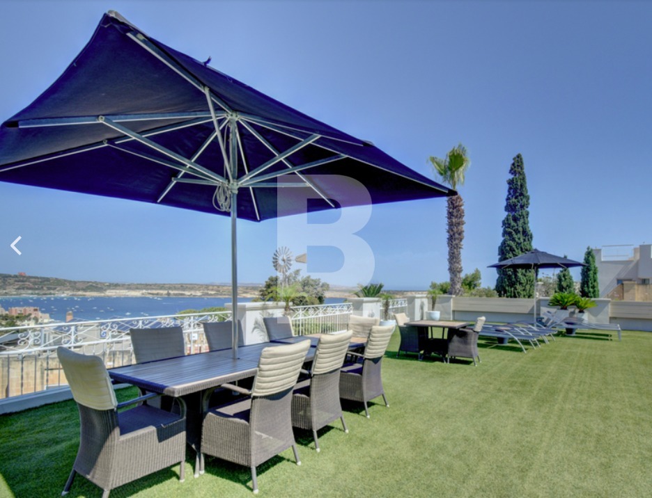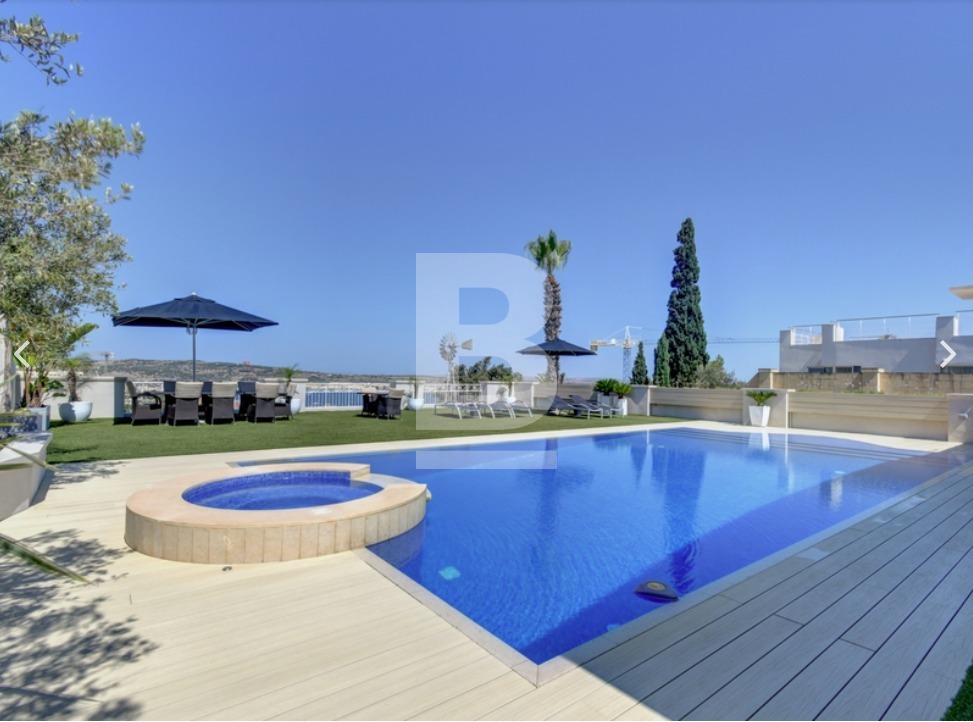 This beautiful, fully detached Villa with an entrance accessible from two roads has been finished to very high standards and enjoys spectacular views of Mellieha Bay, Comino and Gozo from most of it's rooms and terraces. The property comprises an entrance hall, an open plan sitting /dining room, a separate living room and a fitted kitchen with breakfast area, a study, 2 guest bathroooms and four bedrooms one of which includes a walk in wardrobe and en suite.This gorgeous property enjoys the most beautiful outdoor space with a fulll sized swimming pool and jacuzzi surrounded by a beautifully landscaped garden and a large pool deck with shaded seating space and a BBQ where one can really enjoy some al fresco entertaining with family and friends. Also complimenting this Villa is an interconnected 8 car garage and a flatlet having its own separate entrance.