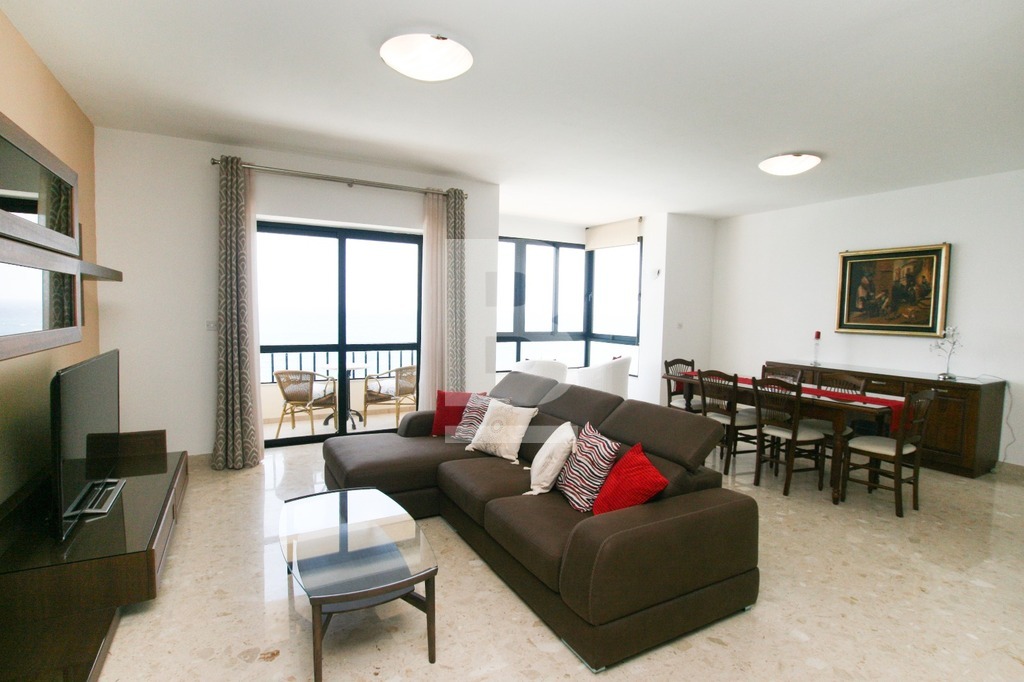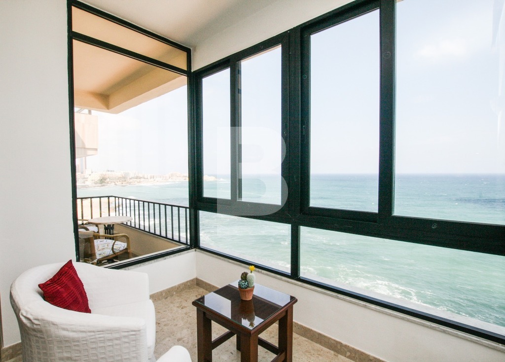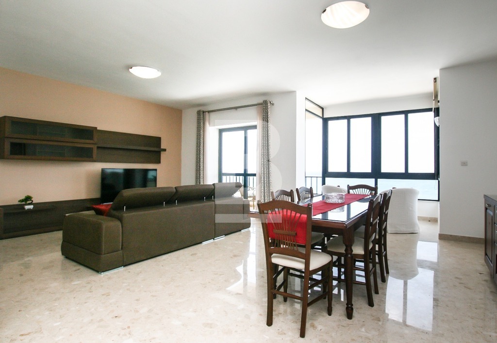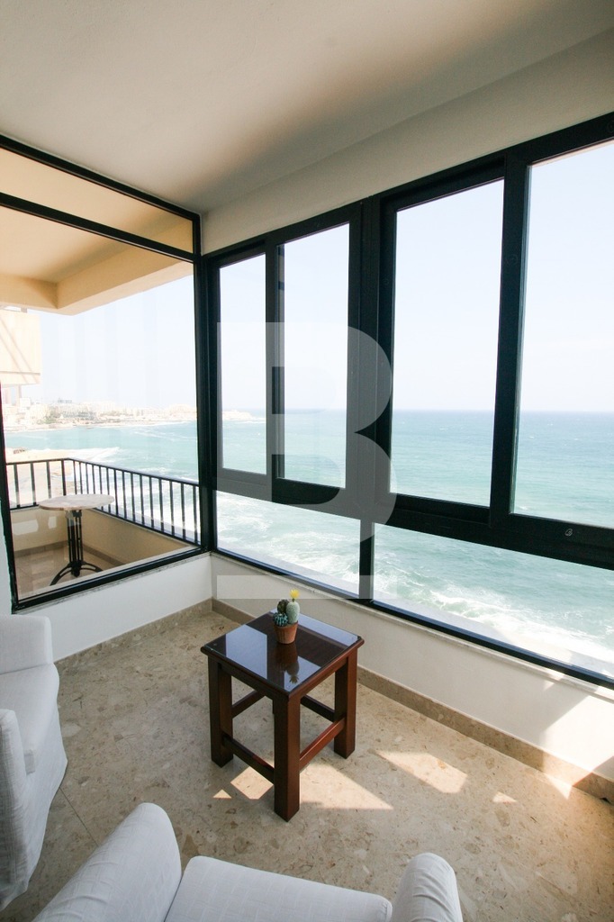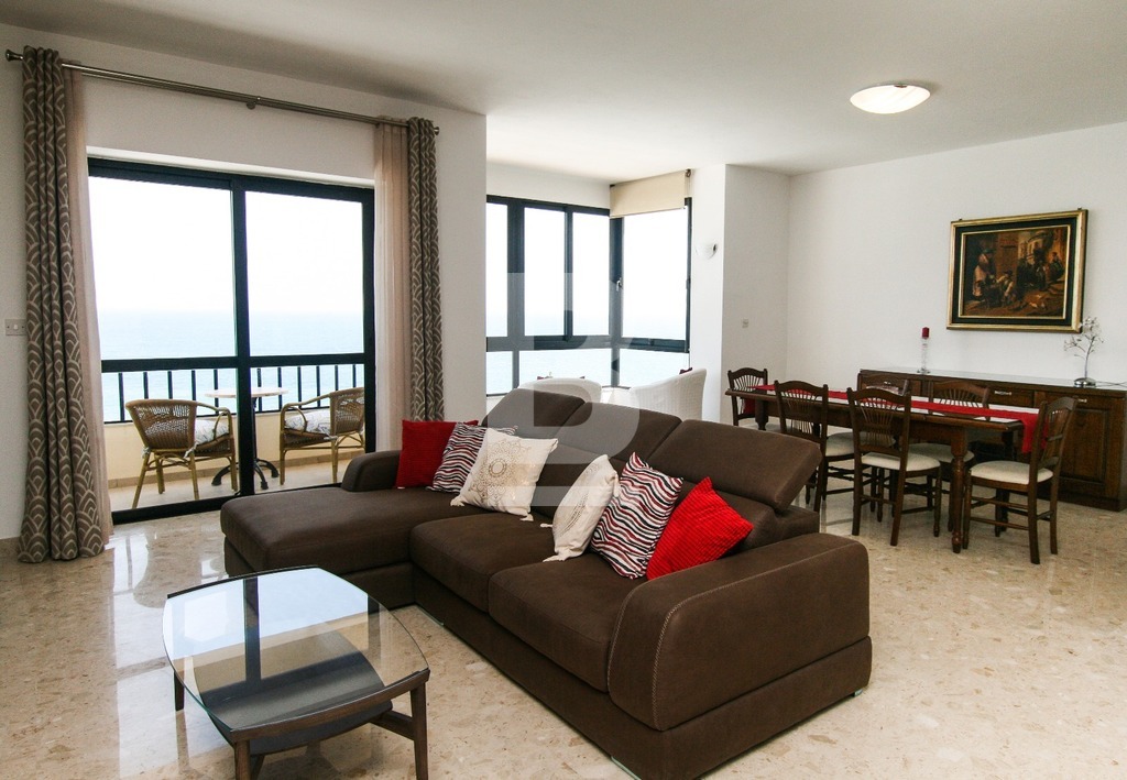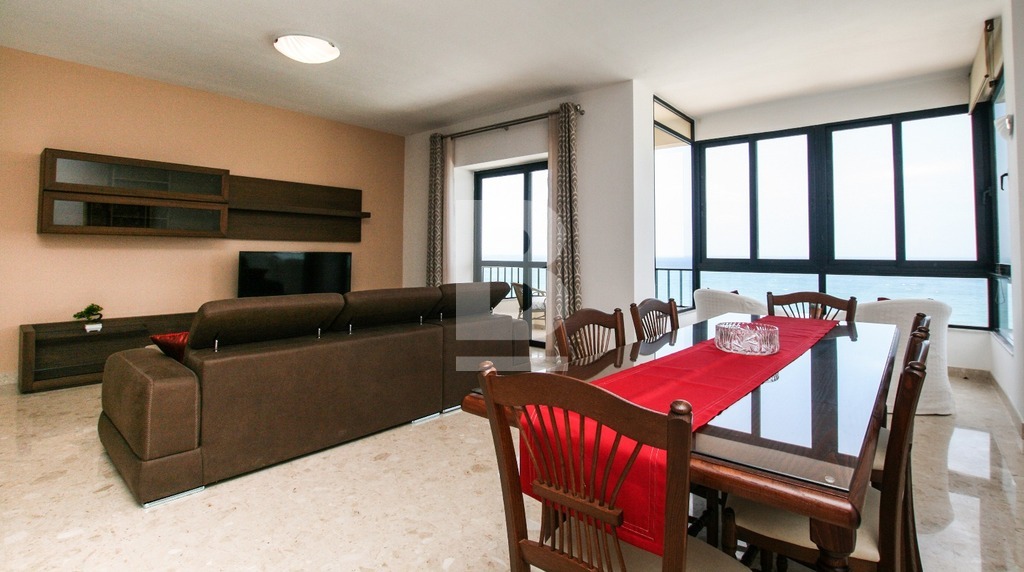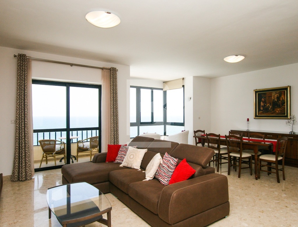 Feel the nice breeze of the Mediterranean sea directly from your living room, when residing in this spacious 3 bedroom sea front apartment. A nice open plan area comprising of an equipped kitchen dining and double fronted living room welcomes you and your guests, leading onto the front balcony with unobstructed seaviews, the ideal swimming spot for locals and expats. Sleeping facilites comprise of 3 large bedrooms, one with walk in wardrobe and en-suite facilities, whilst the other two bedrooms share the main bathroom. Parking arrangements can be made in the underlaying garage. Most shops and bus stops are reachable within few minutes walk, the best location to reside in if you enjoy urban living.