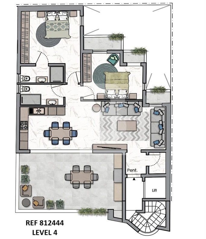 Bright and spacious fourth-floor, corner penthouse, forming part of a small exclusive block of only 4 units, set to begin construction in January 2026, with completion expected by June 2027. Designed with both functionality and elegance in mind, the apartment occupies the entire floor and enjoys a wide frontage and square layout, allowing for abundant natural light throughout through its surrounding balconies. Comprising a spacious open-plan kitchen, living, and dining area, enjoying a spacious terrace, ideal for entertaining, two well-sized bedrooms, main enjoying en-suite facilities, main bathroom, and 3 back balconies. The apartment will be fully thermally insulated and finished with high-quality PVC external apertures. It is being offered semi-finished, excluding bathrooms and internal doors, allowing future owners to personalise these elements to their own taste. The block will include a premium lift and a beautifully finished marble staircase, property is being sold freehold with airspace..