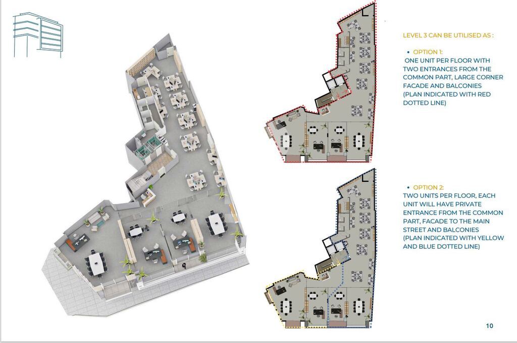 An 8 floor landmark development perfectly positioned between Valletta and Sliema offering breathtaking views overs Marsamxett Harbour and Manoel Island. Office space on level 3 measuring 415sqm having 2 entrances from common part, large corner facade and balconies. Designed with sustainability, this project offers a variety of open-plan spaces ideal for offices, clinics, studios, restaurants and more. Modern lobby with concierge desk and reception area. Basement parking for staff and visitors. On-site maintenance and cleaning services. Completion Q1 2026.