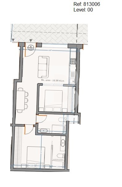 This ground-floor maisonette is being offered in shell form at pre-construction pricing and is fully wheelchair accessible. The internal layout includes an open-plan kitchen, living, and dining area, two bedrooms, and a main bathroom. Completion of the project is anticipated by the end of 2027.