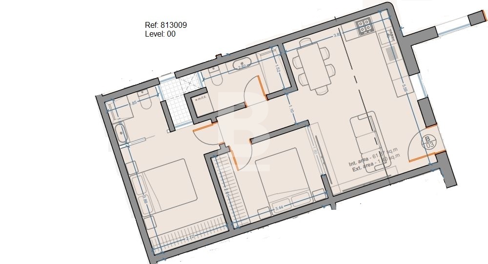 This ground-floor maisonette is being offered in shell form at pre-construction pricing and is fully wheelchair accessible. The internal layout includes an open-plan kitchen, living and dining area leading to back balcony, two bedrooms, and a main bathroom. Completion of the project is anticipated by the end of 2027.