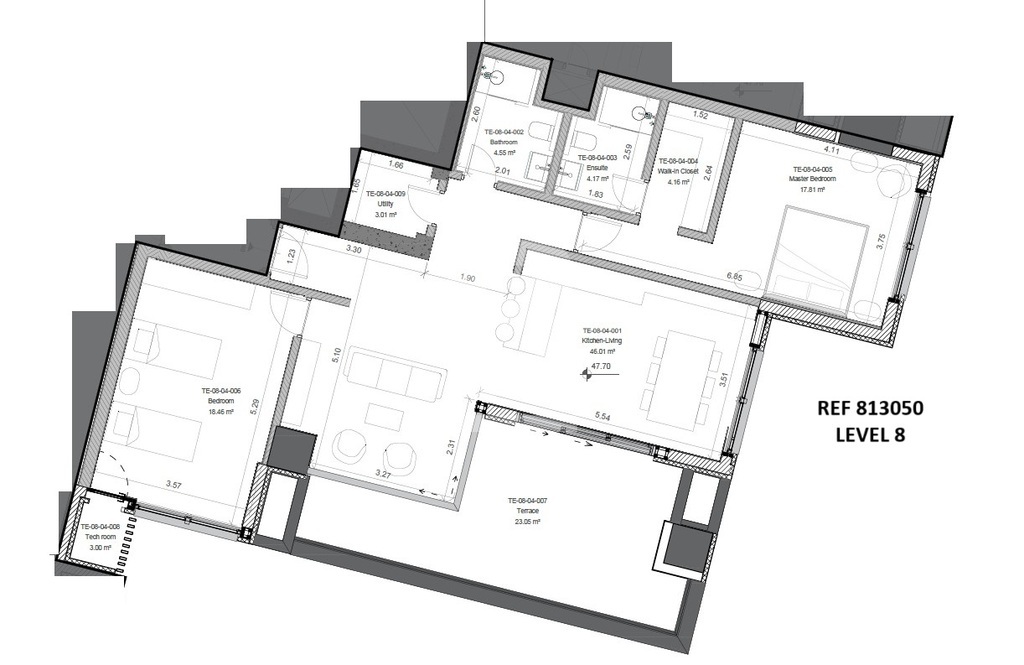 This apartment is 146 sqm CORNER unit, enjoying partial sea views, and is located on the eight floor. Comprising an entrance hall, leading to an open plan kitchen/living/dining area, further leading to a 23sqm corner terrace, bathroom, utility room, 2 double bedrooms, with the main enjoying a walk-in and ensuite facilities.