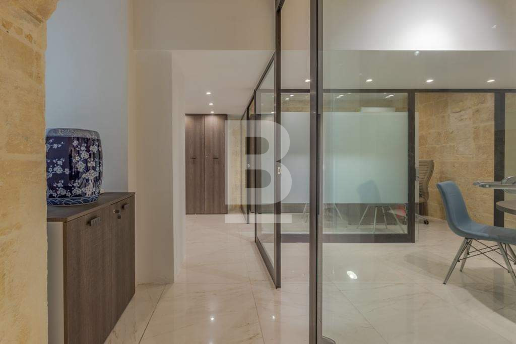 Exquisitely completed and fully furnished INDEPENDENT OFFICE, situated in the heart of Valletta. Positioned to benefit from substantial foot traffic, this space spans approximately 70sqm. This remarkable office space offers a welcoming entrance that leads to a sophisticated reception area, providing a professional and inviting ambiance for clients and guests. The open plan layout of the office is intelligently divided into three functional sections, allowing for efficient organization and utilization of space. The meticulous design seamlessly blends modern elements with the charm of original features, including exquisite Maltese stone and exposed arches, creating an atmosphere that exudes both elegance and authenticity.