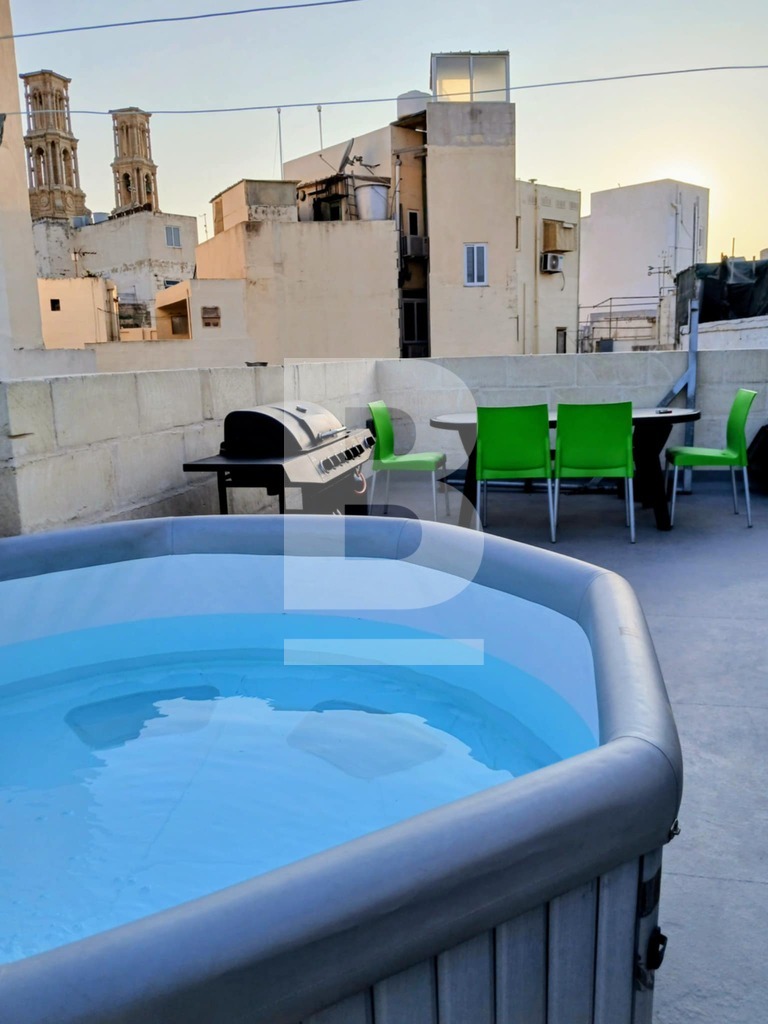 A charming townhouse in the heart of Hamrun close to the vibrant shopping facilities .With a thoughtfully desighned layout having a welcoming entrance with a beautifully restored staircase ,a spacious living room ,kitchen with a decent sized terrace with Mepa approved canopy. A bathroom and washroom illuminated by skylight loft space providing access to the 4 car garage (optional).First floor having a large main bedroom and two single bedrooms ,terrace and a spare bathroom .Top floor having a large bathroom ,kitchette,utility room and an expansive roof area with a pool. Property has been recently refurbished and will be sold furnished.