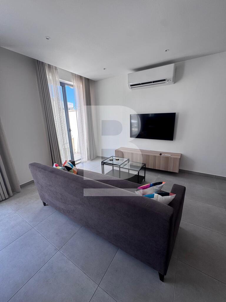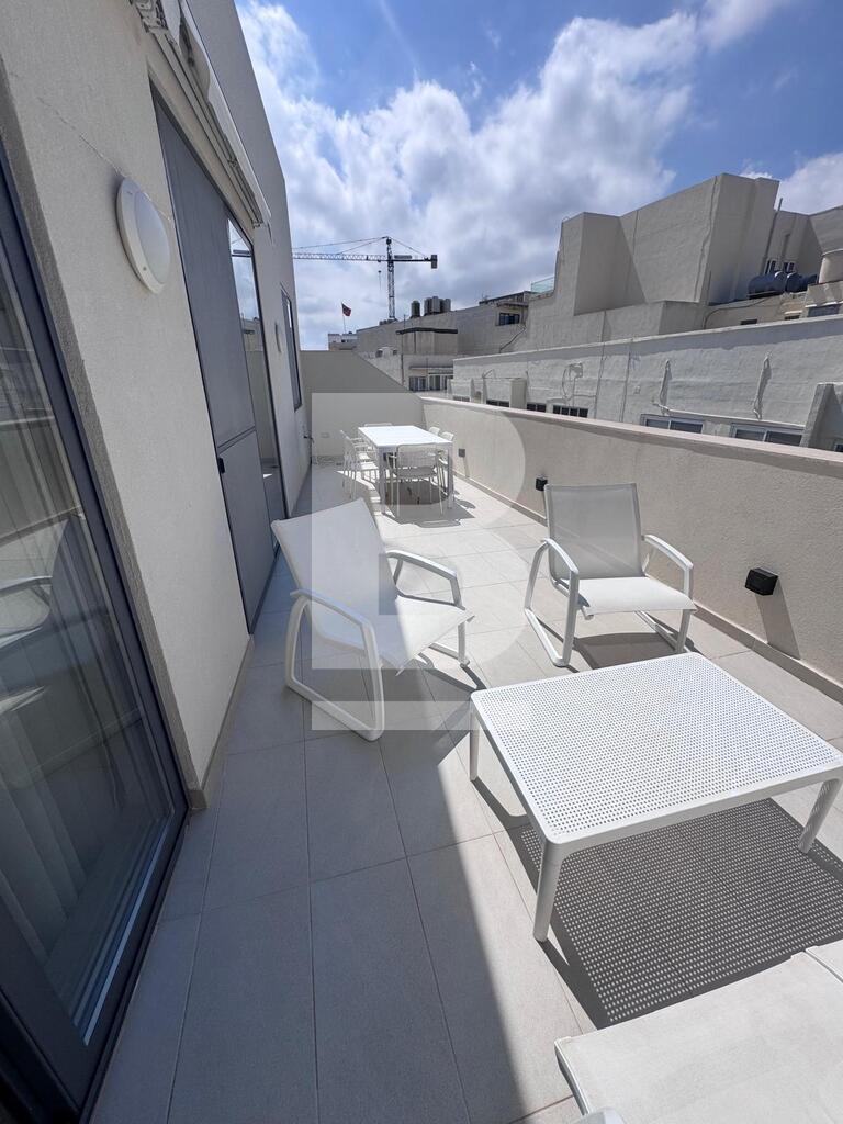 Modern Penthouse with Terrace & Views. A brand-new, beautifully furnished penthouse situated on the 5th floor of a smart block of nine. Layout comprises an open-plan kitchen, living and dining area leading onto a front terrace with outdoor seating, dining space and distant sea views. The property offers open plan kitchen/sitting/dining, one double bedroom with en-suite, one single bedroom, shower room, washroom and is finished to a very high standard throughout. Ideally located in one of Sliema's best areas and close to all amenities.