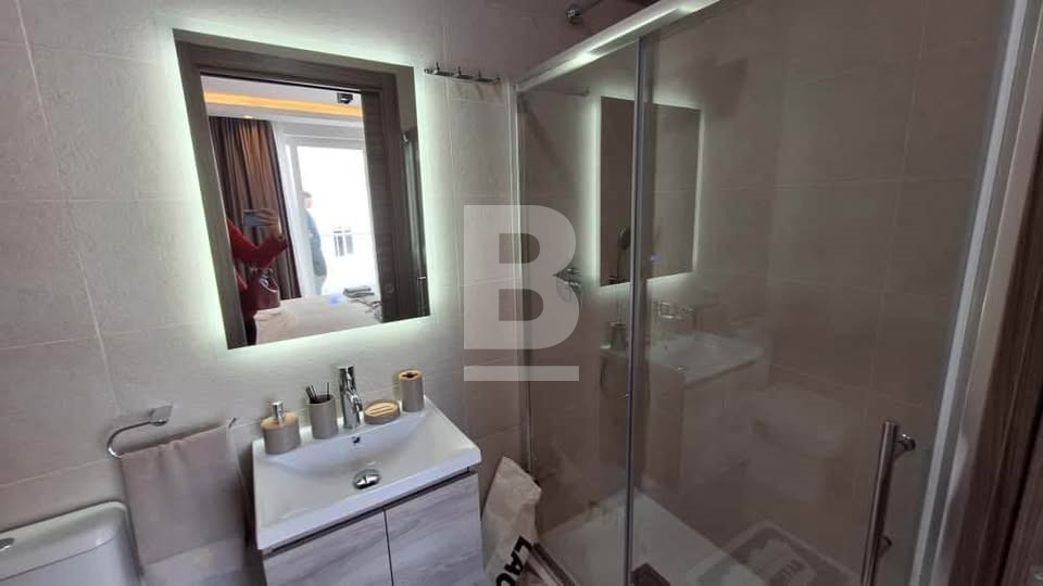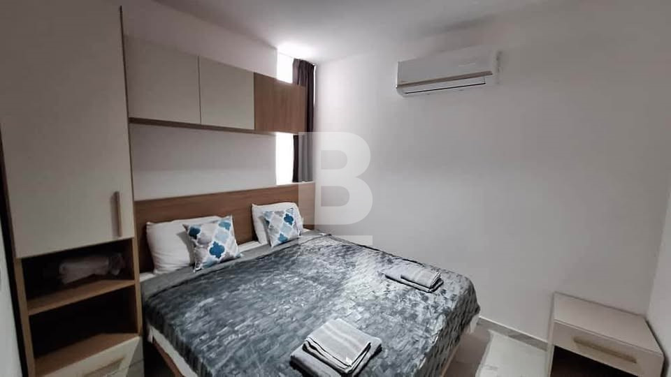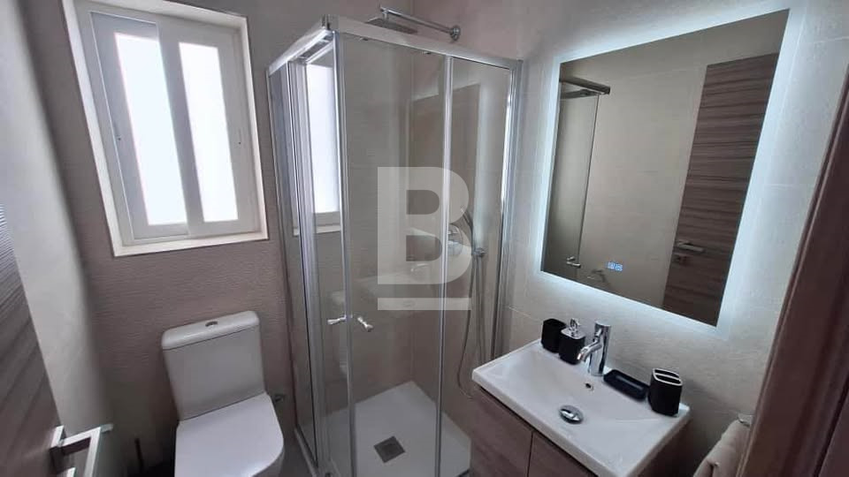 The primary bedroom boasts an en-suite shower room and a private back balcony. The second double bedroom is well-sized and filled with natural light. The property also includes a bathroom with a shower. Fully air-conditioned throughout for maximum comfort.
