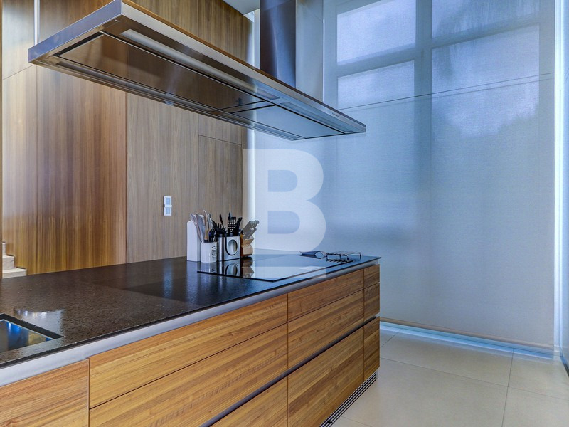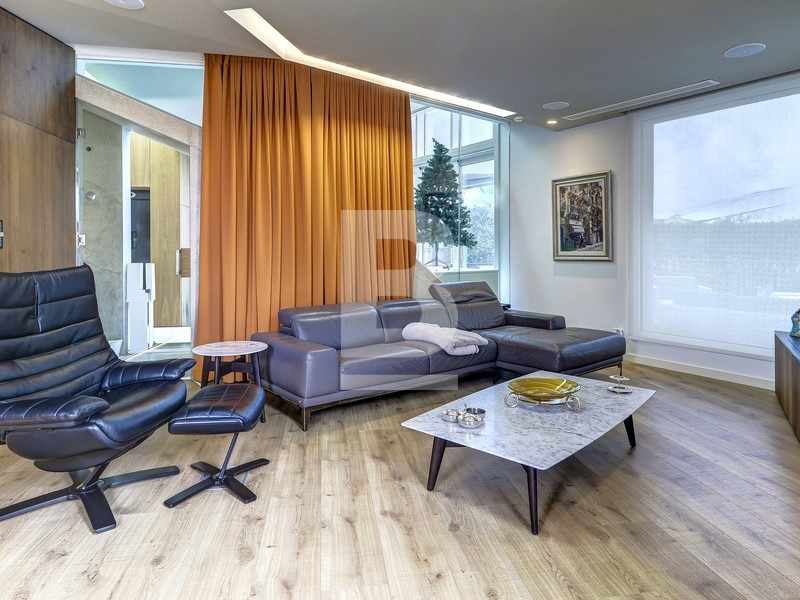 This stunning property showcases exceptional architectural design and a lavish layout, featuring high ceilings, expansive high-end apertures, and a beautifully designed modern glass staircase leading to all floors, complemented by an internal lift.