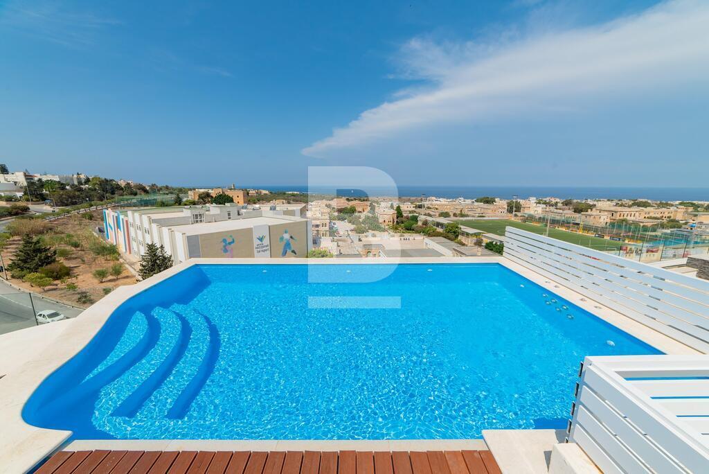 A tastefully finished 3-bedroom penthouse with a private pool, located in the sought-after residential area of Ibrag, yet just minutes from Malta’s prime locations, including St. Julians and Sliema. Situated on the 5th floor of a modern block, this property is close to a range of local amenities, including supermarkets, schools, coffee shops, pharmacies, bus stops, and a sports center. The penthouse features two spacious terraces that flood the apartment with natural light, with the front terrace offering stunning distant sea views and its own private pool. The interior comprises an open-plan kitchen, living, and dining area, three double bedrooms each with en-suite showers, and a separate guest bathroom. A large lock-up garage is also included. This is a unique property that combines modern comfort with a prime location, viewing is highly recommended.