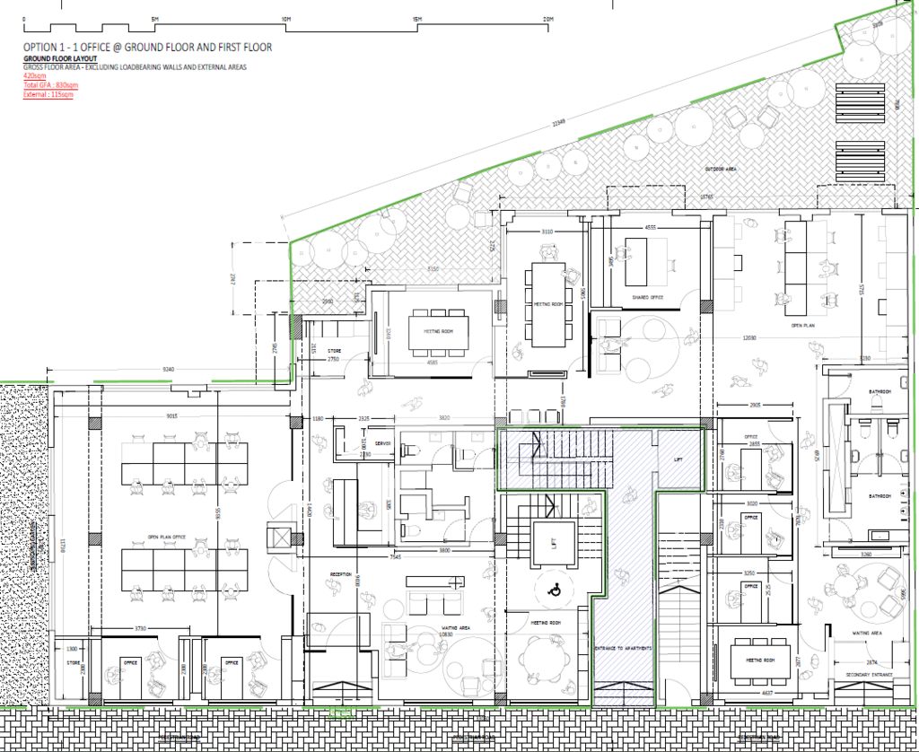 The first floor office enjoys a spacious internal area of 410sqm featuring a reception area, kitchenette, and boardroom, with flexibility to incorporate partitioned offices or meeting rooms according to the purchaser’s requirements. The ground-level office space internally measuring approximately 420 sqm is available, together with two private outdoor areas having a combined area of approximately 115 sqm — ideal for staff recreation or client events.