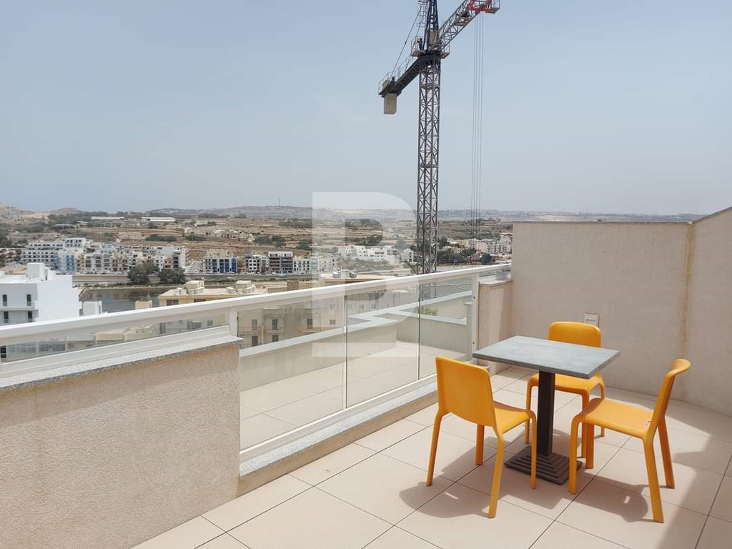 An exceptional one-bedroom penthouse located in a sought-after area of Qawra, enjoying stunning sea views. The property features an open-plan kitchen, living, and dining area leading onto a spacious terrace ideal for outdoor entertaining, a double bedroom, and a modern bathroom. Fully furnished and finished to a high standard, this penthouse offers contemporary living just moments from the promenade and all amenities.