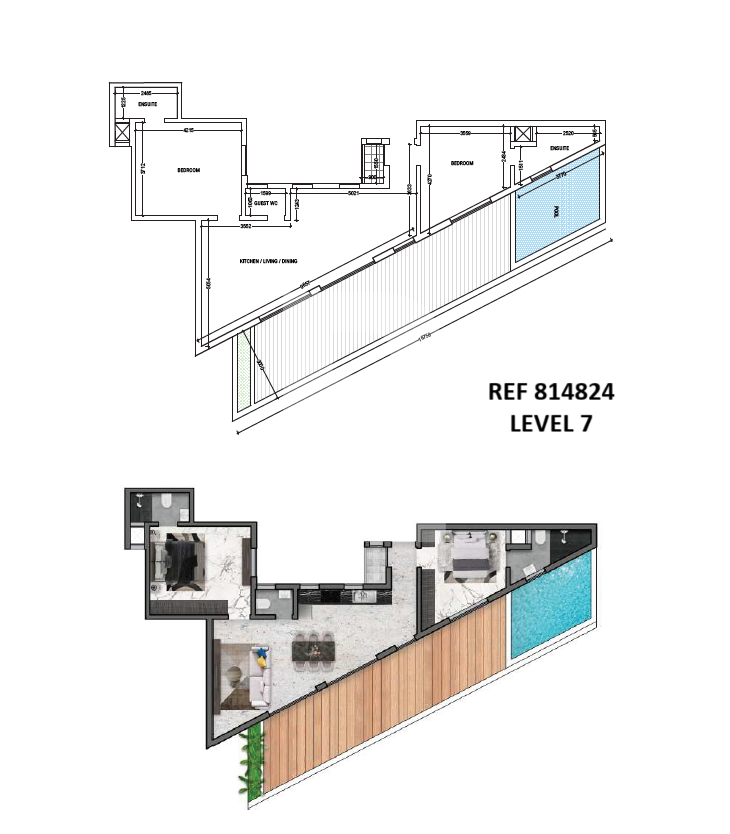 The project has been designed with the primary focus of providing accommodation that meets the demand of the location. Being at the meeting point of two roads, the location offered the unique opportunity to create a very recognizable building with its own elegant identity. The details, palette and materials are all being selected to provide a clean rhythmic facade with a welcoming entrance to this lovely project. The Penthouse is on a footprint of 132 sqm, it comprises an open plan leading out to a front terrace with pool, 2 double bedrooms both having en-suite and a guest toilet.