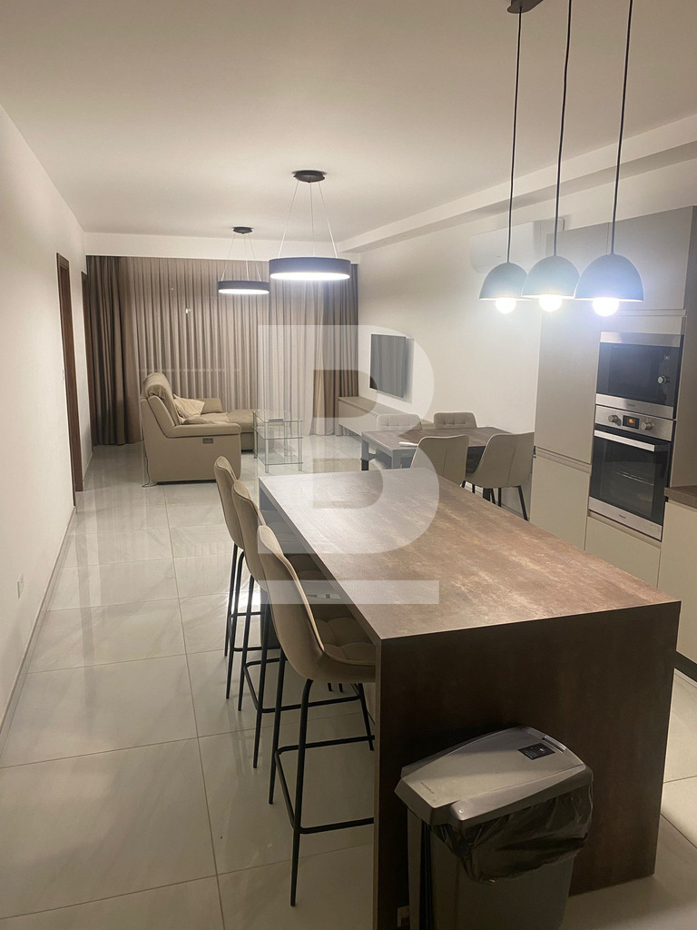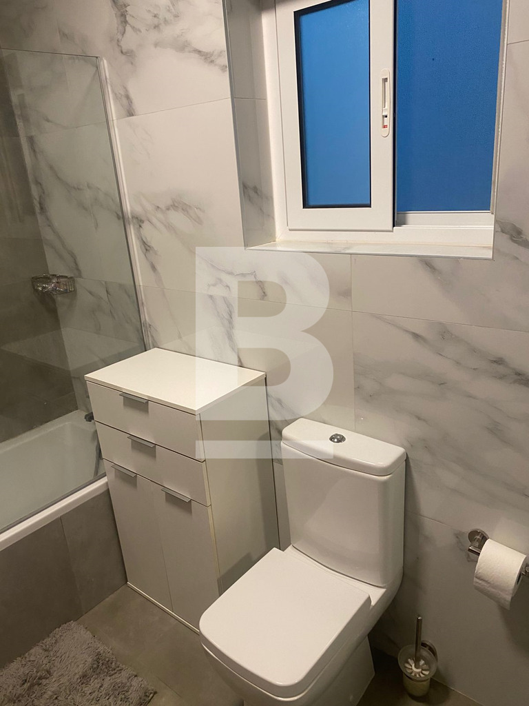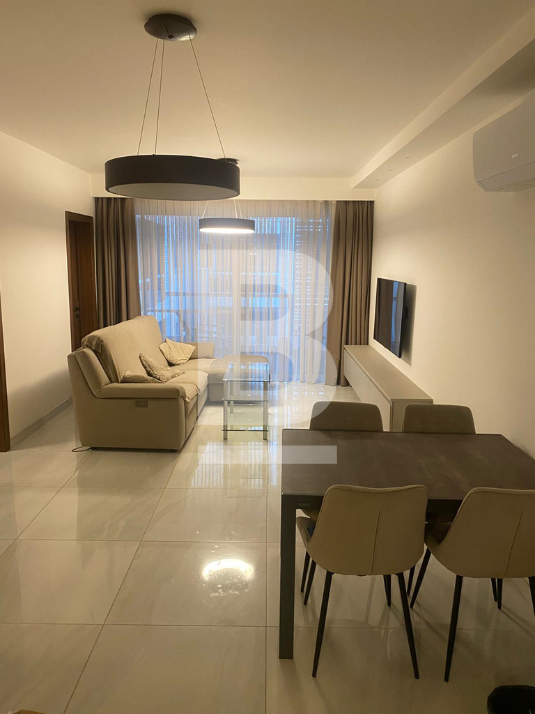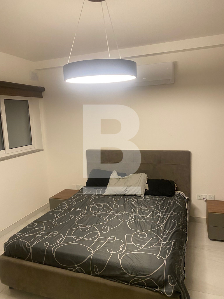 Bright and Modern Apartment just 2 minutes walk from the Qawra Seafront. Comprising 2 double bedrooms, 2 bathrooms ( 1 being an en-suite ), a boxroom with the washing machine and storage space, a fully fitted open plan kitchen, living and dining area with an interconnected front balcony enjoying outdoor lounge furniture perfect for relaxing in style. The property is fully air-conditioned, situated on the 5th floor with lift servicein the block and located close to shops, butchers, pharmacies, bus stops and more...