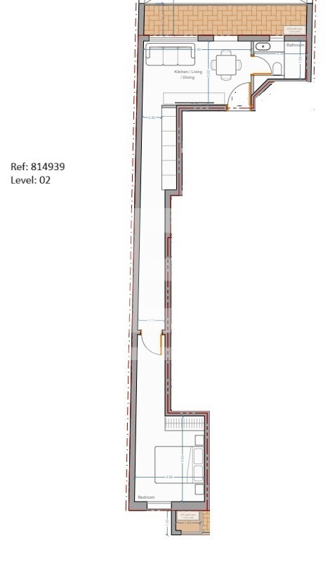 This second-floor unit is offered in shell form, with completion scheduled for March 2028. It features a kitchen/ living/ dining area leading to a terrace, a comfortable double bedroom, and a bathroom. Optional garages are also available.