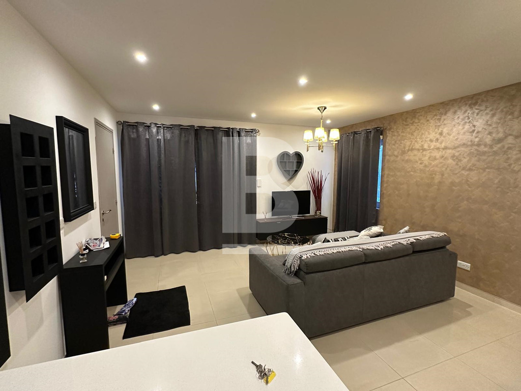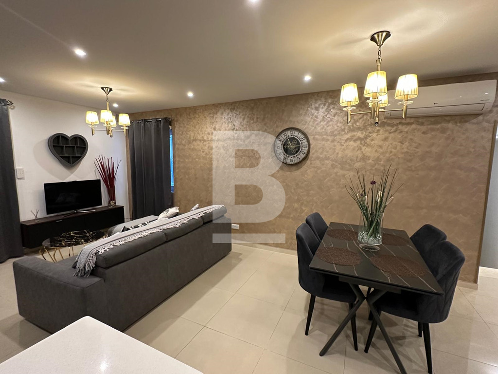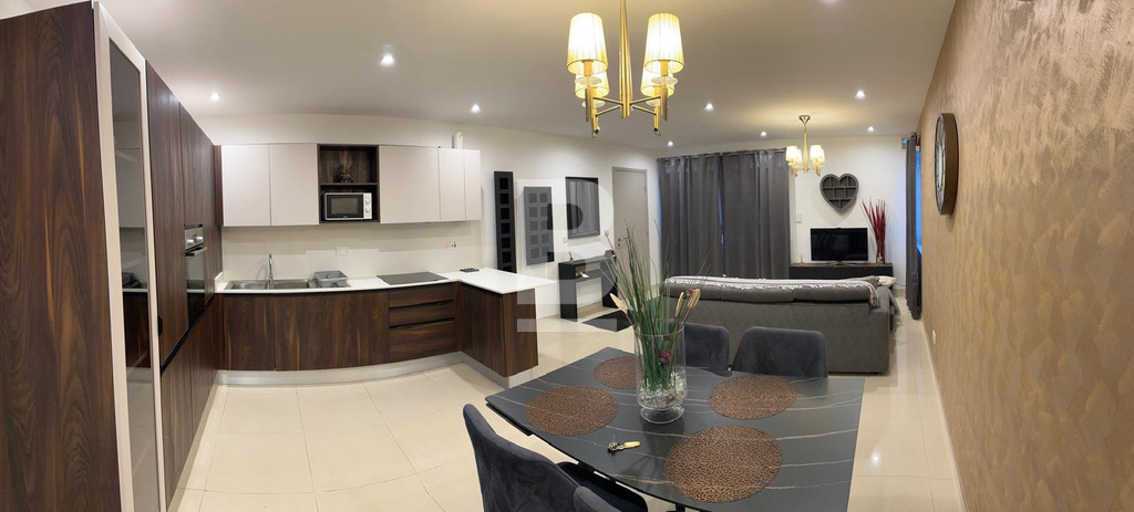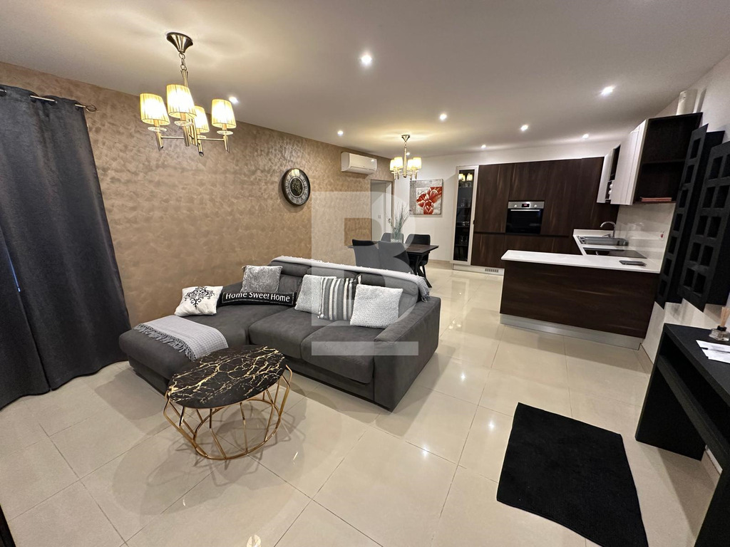 It includes a beautiful, modern kitchen with a dining area, perfect for enjoying home-cooked meals. The apartment also has two well-appointed bathrooms for added convenience. Overall, it’s an excellent choice for families looking for comfort, style, and functionality.