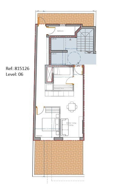 This sixth-floor penthouse is being sold in shell form, with completion planned for March 2028. The layout features an open-plan kitchen/living/dining area leading to a spacious front terrace ideal for entertaining, a double bedroom, a study, a bathroom, a laundry room, and a back terrace. Optional garages are also available.