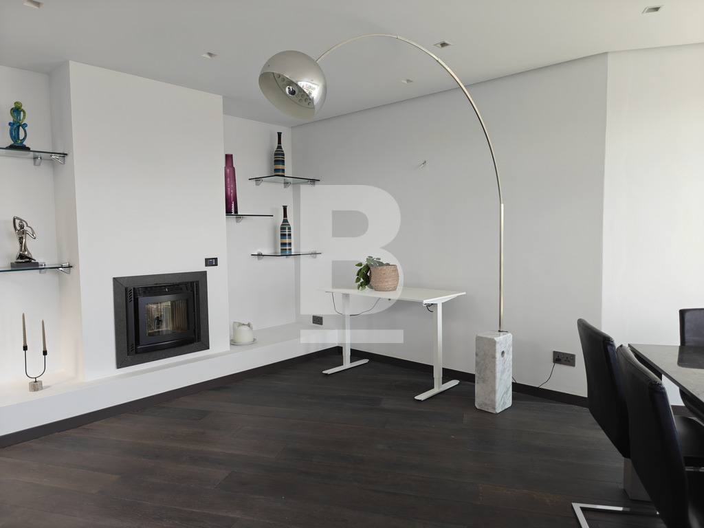 The upper level features a welcoming entrance that opens into a spacious open-plan area with a fully fitted kitchen equipped with quality appliances, a breakfast bar, and a guest WC. The bright living and dining area, complete with a pellet stove, leads onto a large front terrace that creates an easy indoor-outdoor flow. It’s an ideal space for entertaining or enjoying everyday living, with panoramic sea and Sliema coastline views.