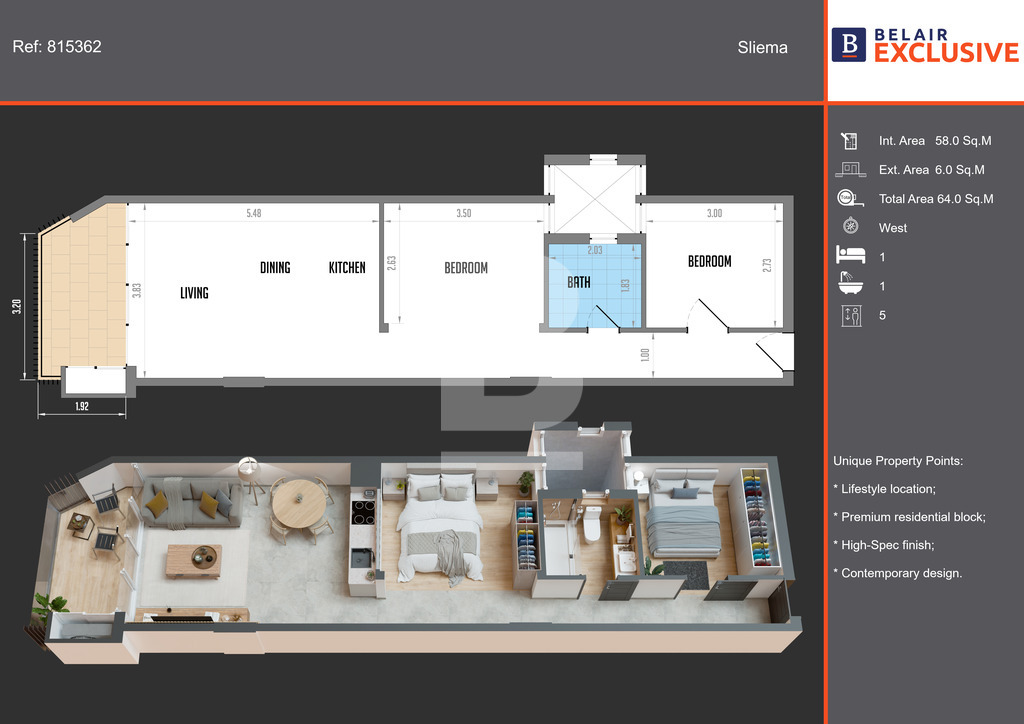 Set on the 5th floor of a superb new development in one of Sliema’s most desirable locations, this modern studio with a useful extra room is an excellent opportunity, ideal as a rental investment or as a comfortable home just moments from the town’s shopping hub, cafés, restaurants, lidos, beaches and more. The layout includes a welcoming entrance hall, a bright open-plan kitchen, living and dining area leading onto a front terrace, a double bedroom, a versatile games room or home office, and a well-designed bathroom. The unit will be finished to a high standard, including bathrooms and internal doors, with completion planned for summer 2026.