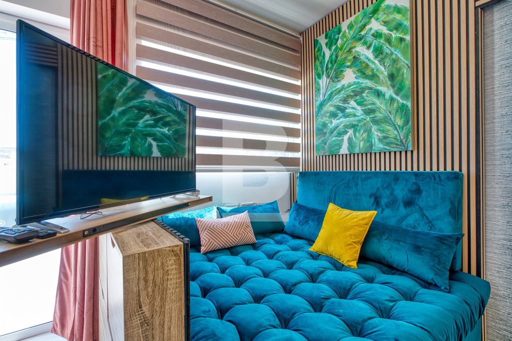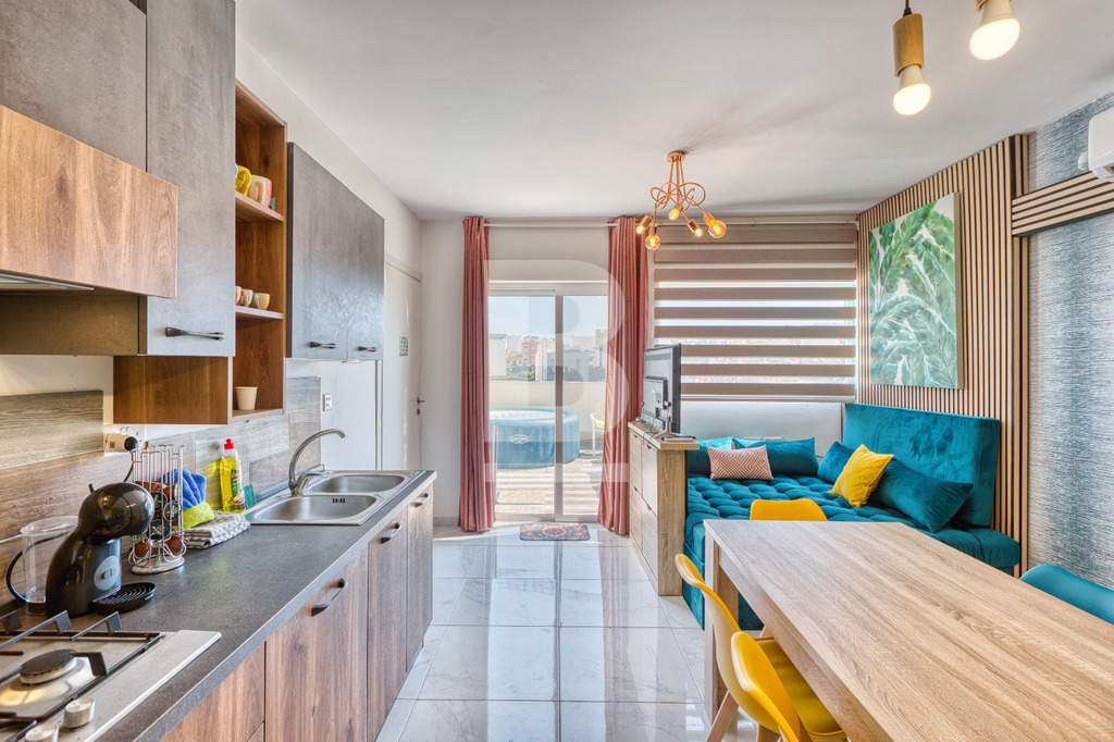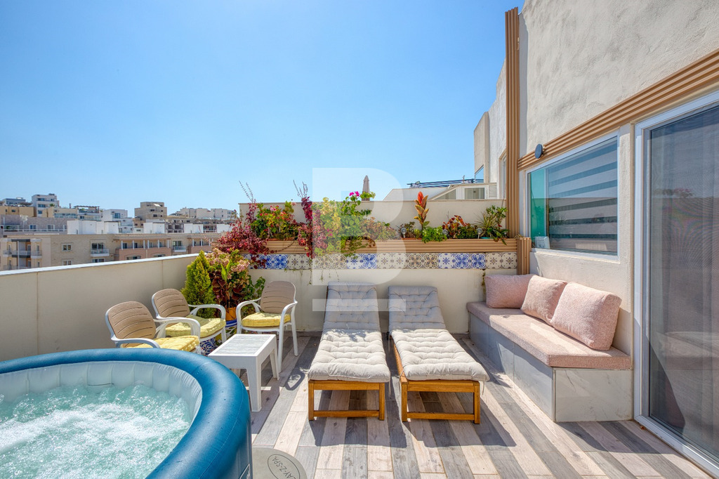 The penthouse enjoys a beautiful terrace garden ideal for both relaxing and entertaining, complete with a six-seater hot tub, outdoor sofa and deck chairs, all set against breathtaking marina and Valletta views. A second back balcony overlooks gardens and pools, with charming views of the church and the city skyline.