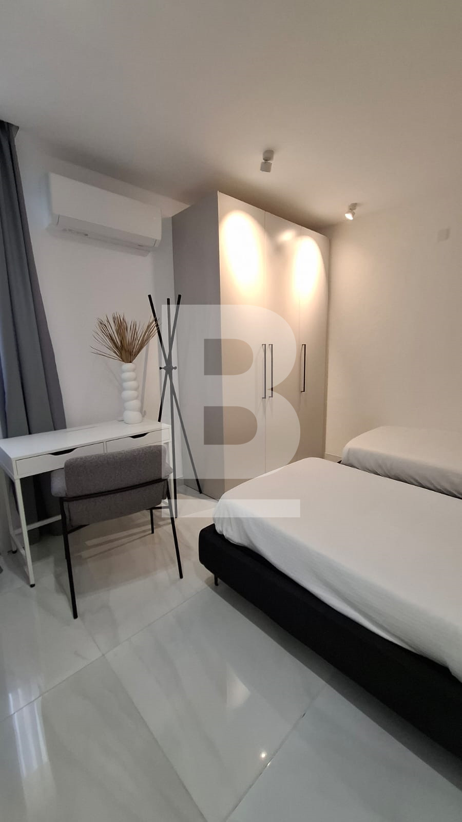 It features two spacious bedrooms and two modern bathrooms, offering both privacy and convenience. One bedroom is furnished with two single beds, while the second bedroom has a comfortable double bed, making the layout ideal for families or groups.
