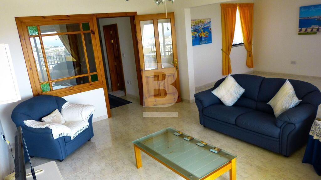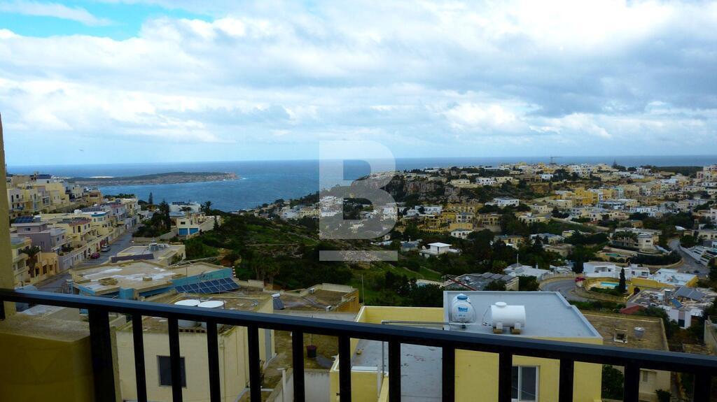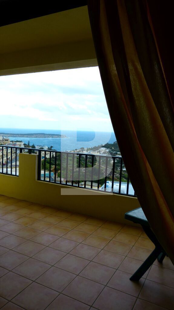 A bright and charming fully furnished apartment with astonishing view in a quiet and residential area of Mellieha a 5min walk away from all shops and amenities. The flat consists of 3 bedrooms (2 double and the last one has 2 single beds) 1 main bathroom, and en-suite shower room in the main bedroom, a large kitchen and a comfortable sitting / dining room opening on a beautiful terrace overlooking Mellieha bay. The apartment is lit by an abundance of natural light and the absence of vis a vis gives it plenty of privacy. Additionally, there is access to a communal rooftop terrace facing inland views of the lovely Santa Maria Estates. The apartment is partially air-conditioned. Exceptional property for a small family.