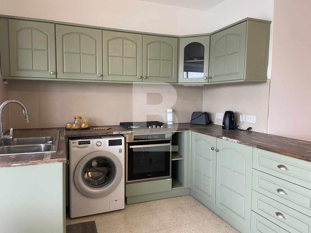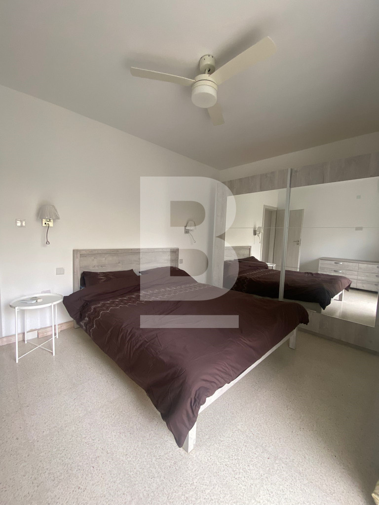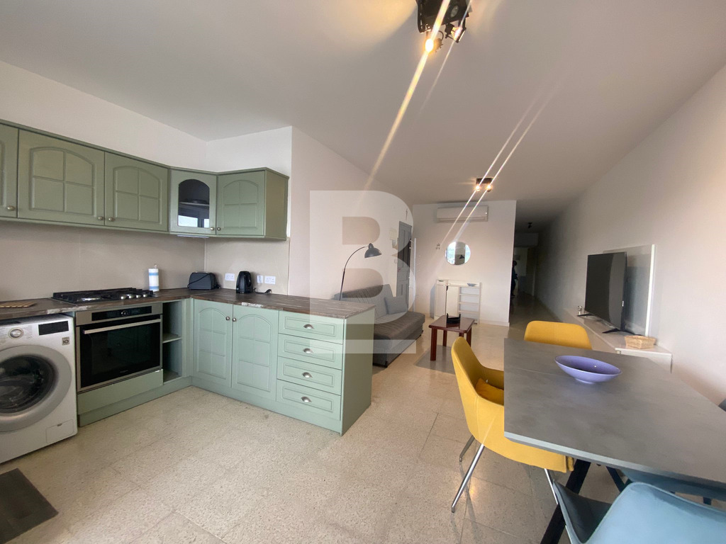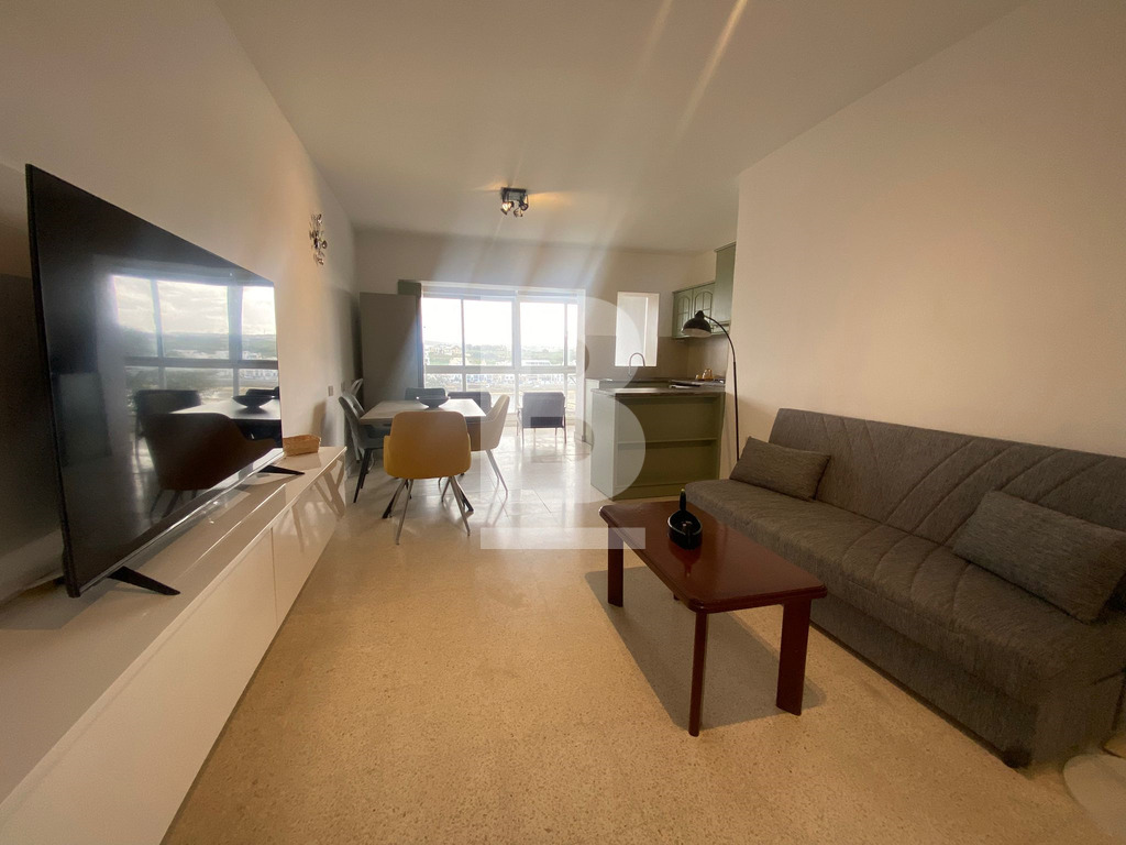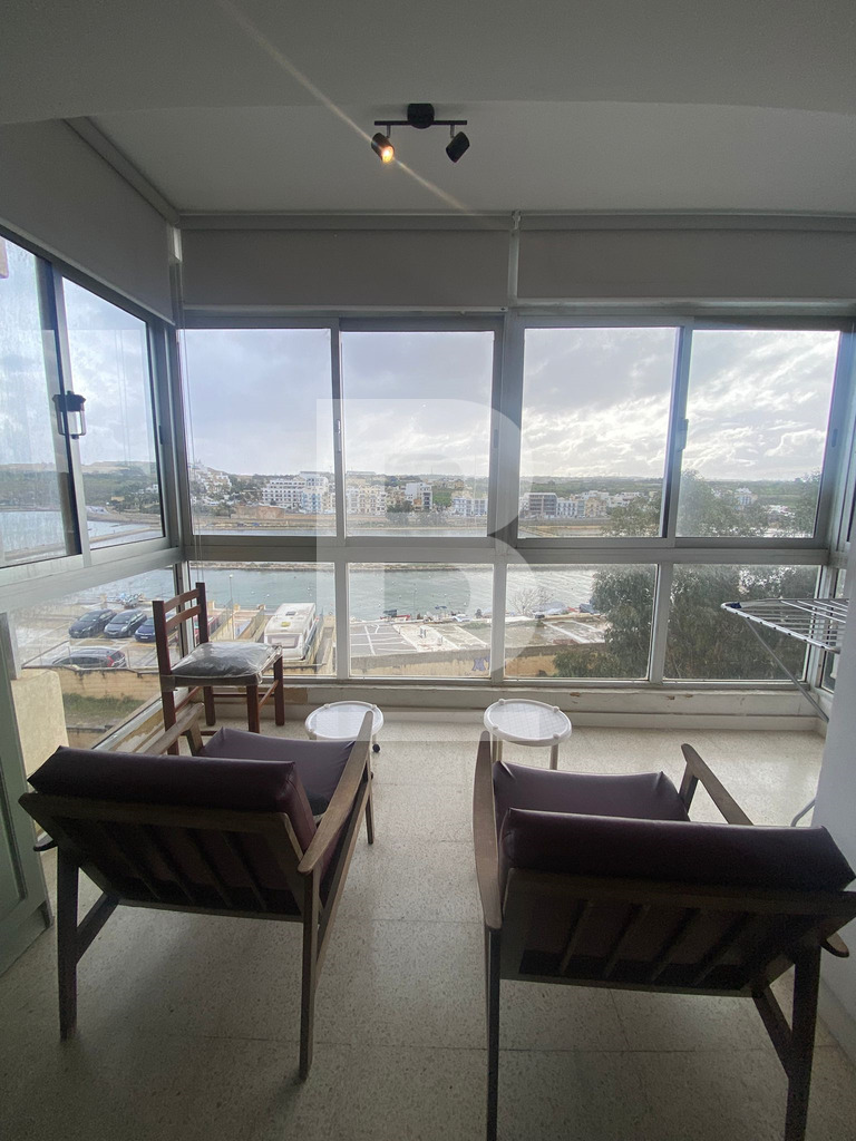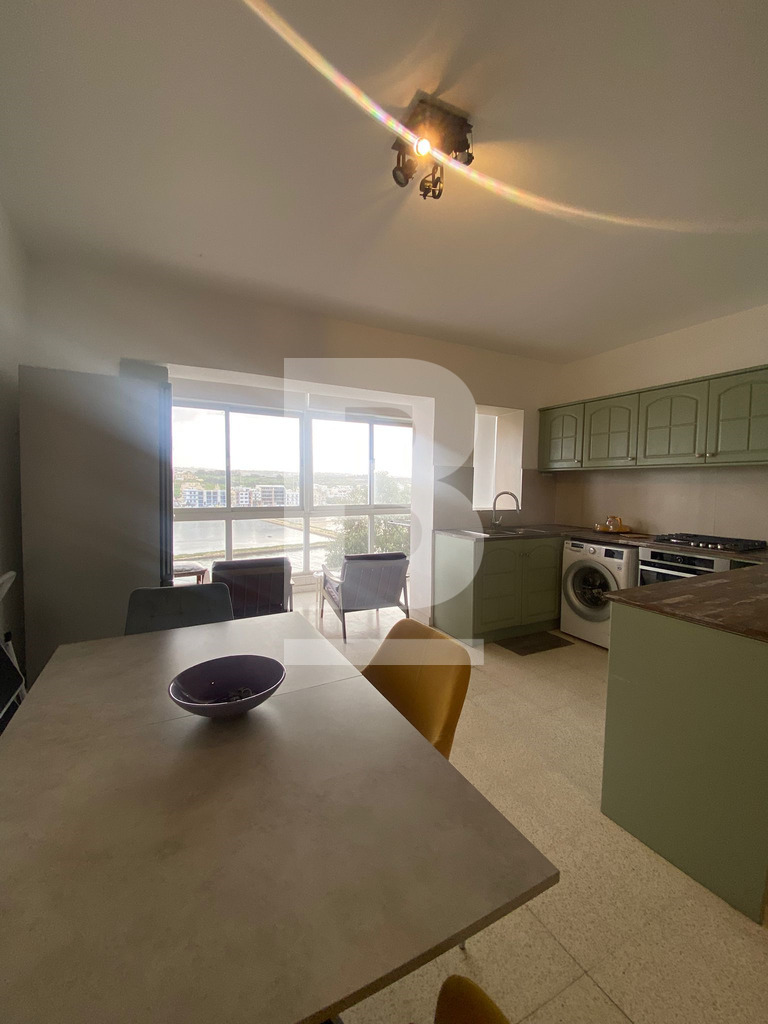 APARTMENT for rent in QAWRA, close to all amenities. Property comprises an open-plan kitchen, living, and dining area, leading onto a front-facing balcony with sea views, three bedrooms, the main with a back balcony, and a main bathroom.