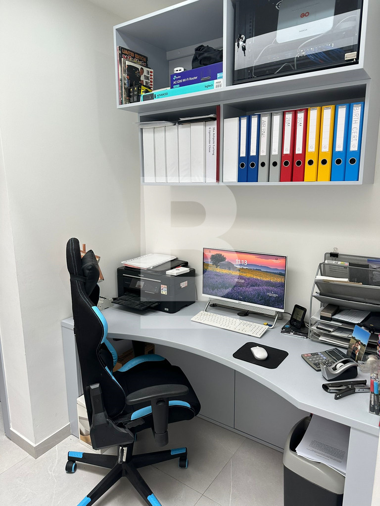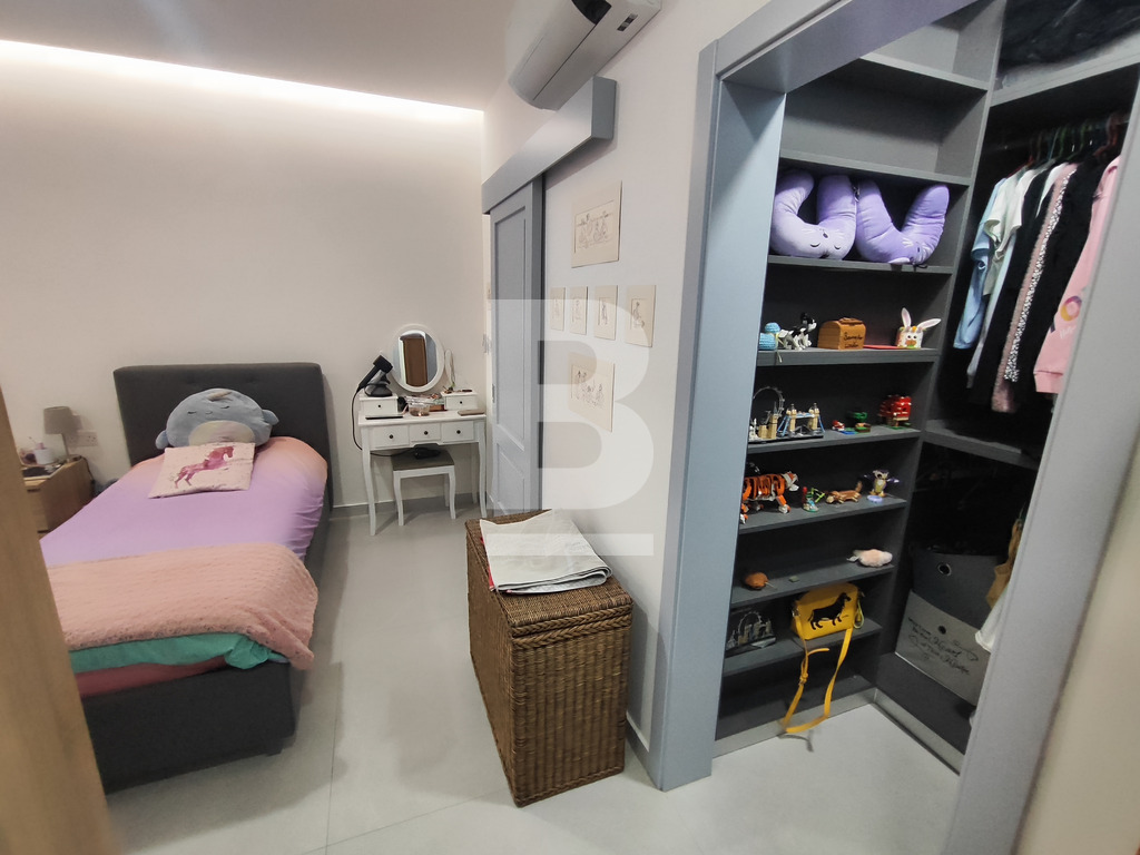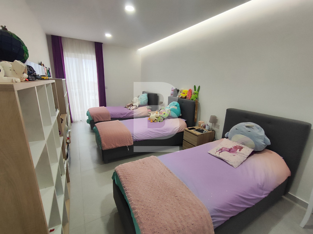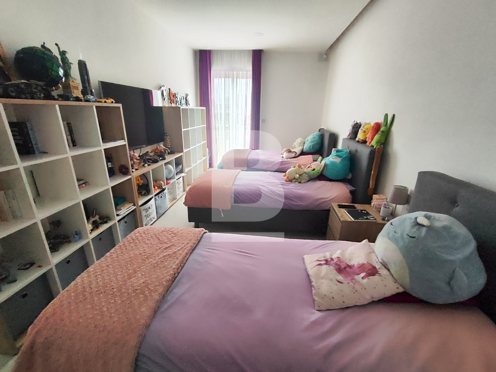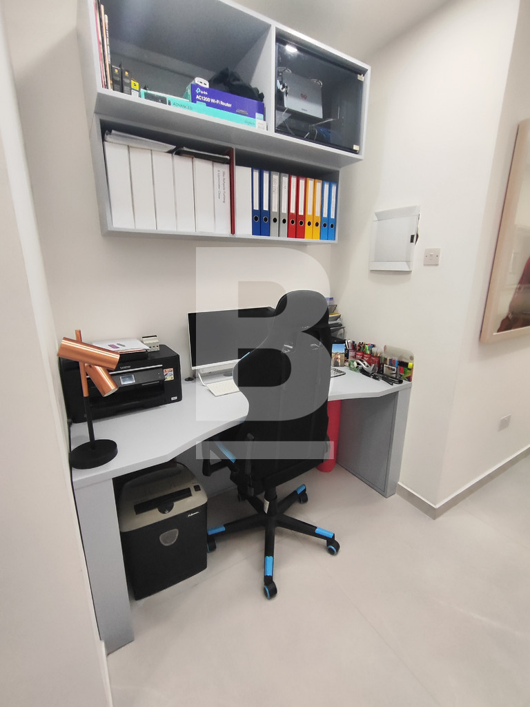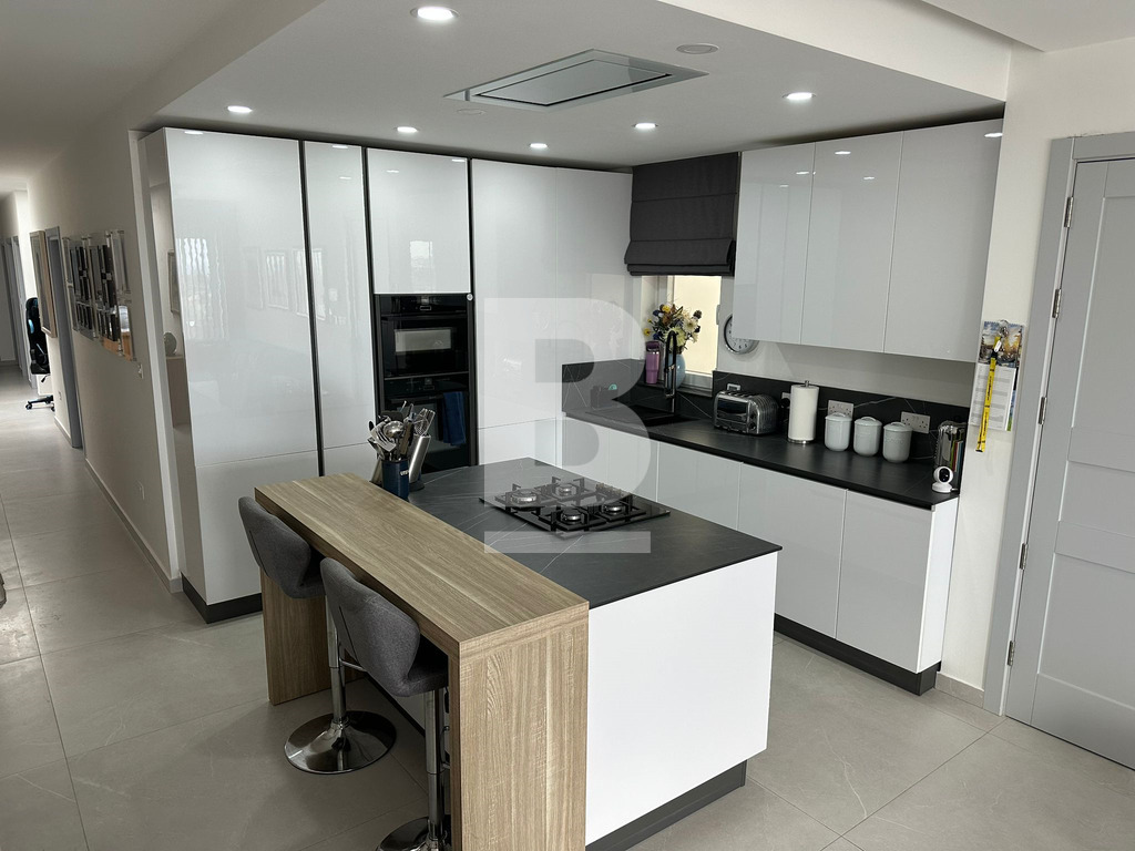 The main level further offers a wide corridor leading to three spacious double bedrooms. The main bedroom includes a walk-in wardrobe and ensuite bathroom, while the second large bedroom also enjoys its own walk-in wardrobe and ensuite. The third bedroom is serviced by the main bathroom. Additional features include a study area beneath a beautiful skylight, a box room, a laundry room, and a dedicated boiler room for the underfloor heating system.