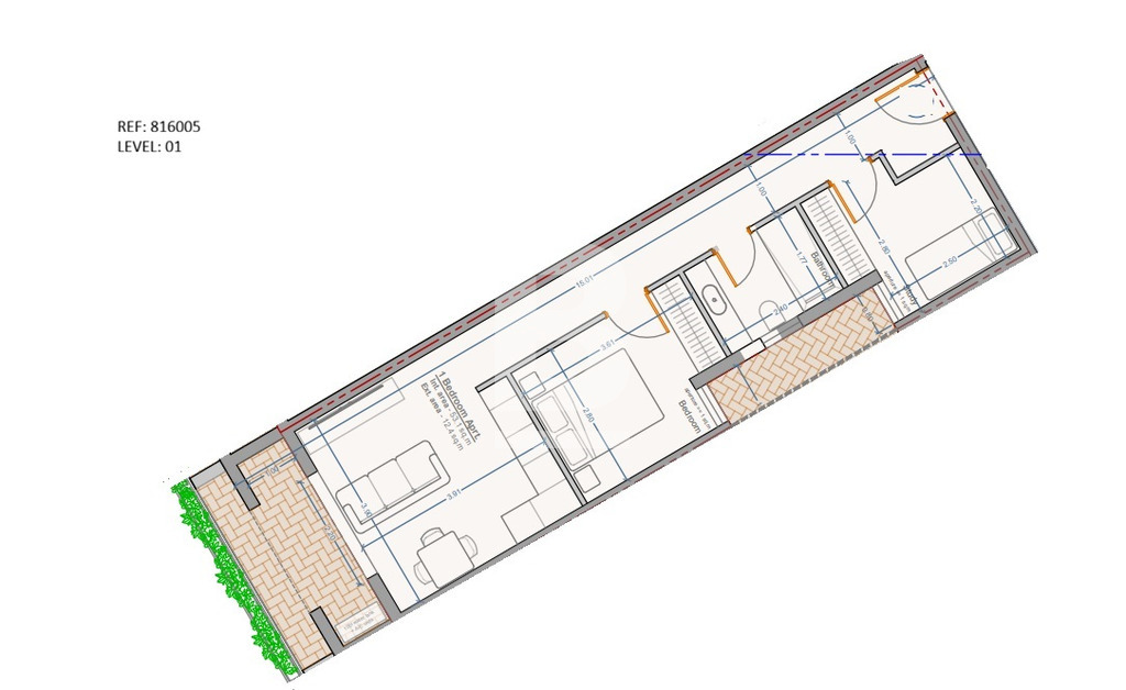 This first-floor unit, offered in shell form, features an open-plan kitchen, living, and dining area leading to a front terrace, one bedroom plus a study that can be converted into a single bedroom and a bathroom. Free-hold.