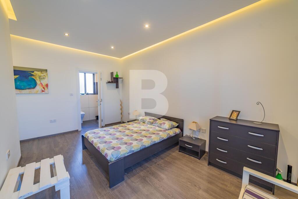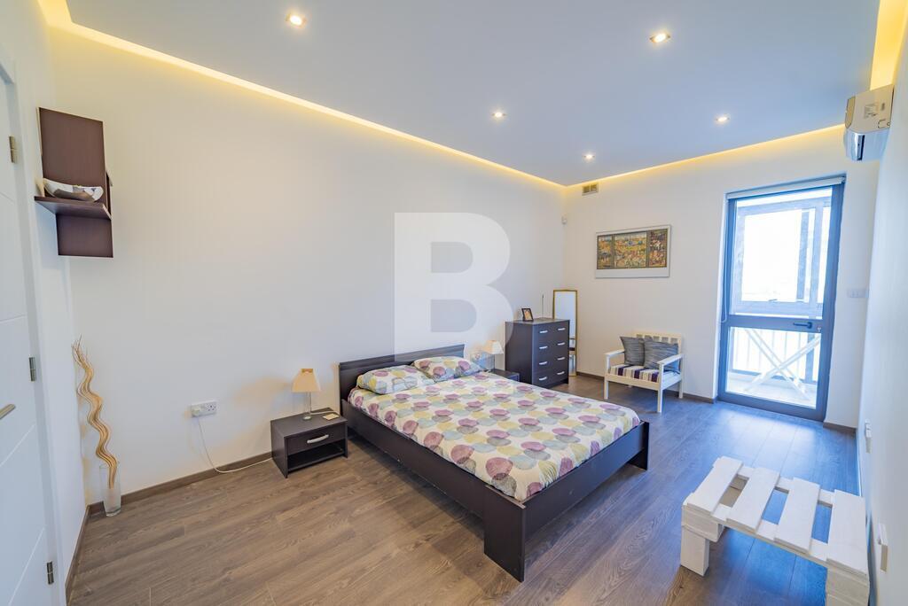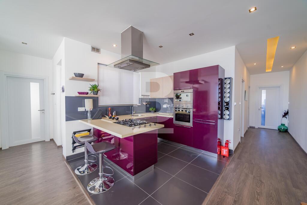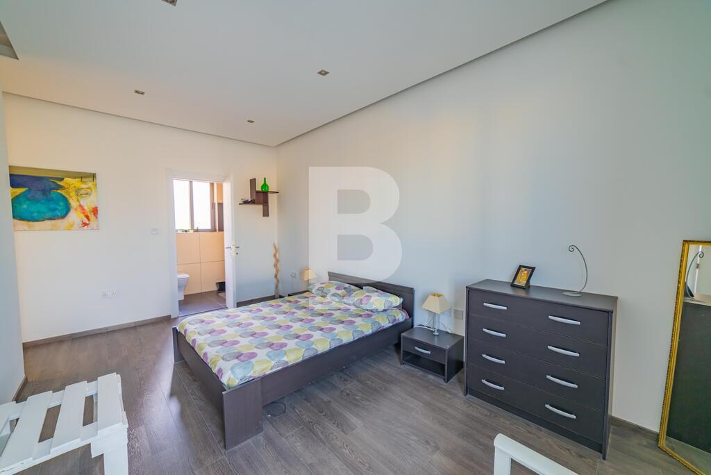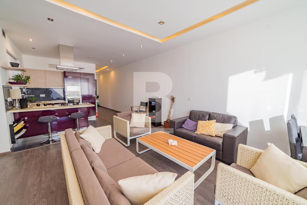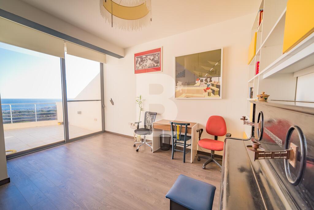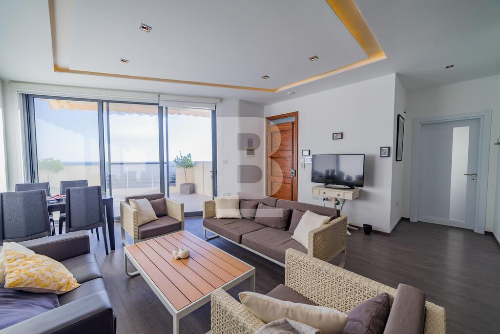 A large modernly designed third floor penthouse with outstanding sea views from its terrace and five minutes walking distance to Smart City. Property comprises an open plan kitchen / living / dining area leading to a spacious terrace, three bedrooms ( en-suite bathroom ) and main bathroom. This property is equipped with air-conditioning units and includes TV, washing machine, dishwasher, lift, intercom. Enjoy full ownership of the roof and airspace, with recently upgraded terraces (new tiling) and a newly treated roof. The property also benefits from 8 installed solar panels for improved energy efficiency.