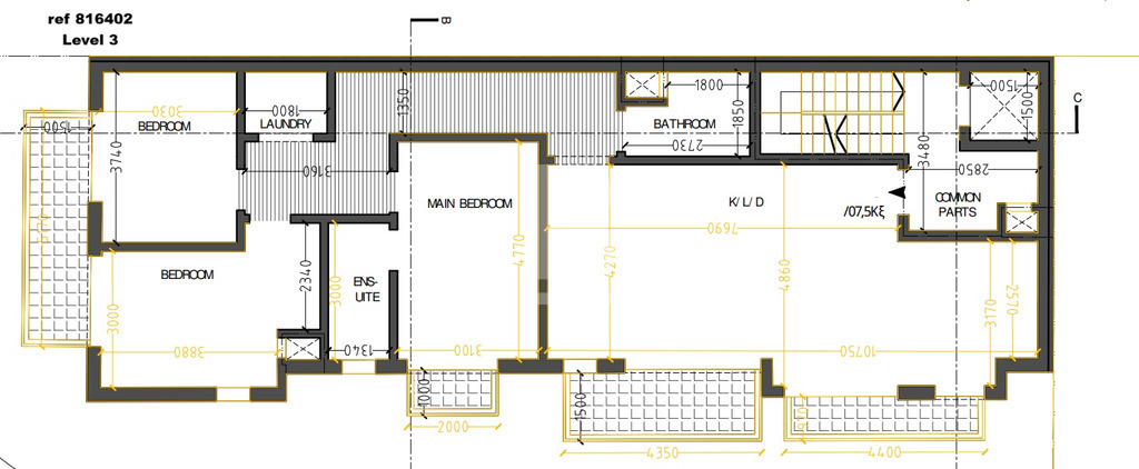 The layout comprises a generous open-plan kitchen / living / dining area leading onto a large terrace, three bedrooms, main bedroom with an en-suite, and a guest bathroom. A laundry room adds further practicality.
