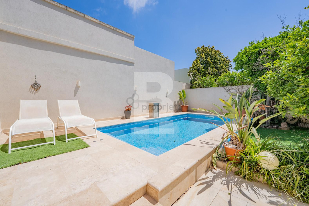 Rare to come by, a fantastic family home, a semi-detached villa in Rabat in an excellent countryside location. The mature front garden and the 3-car drive welcome you to a grand, modern entrance hall, a large open plan kitchen living dining, complete with a fireplace, overlooking the sunny back garden with pool. The modern bright open kitchen area offers a large dining area and a large everyday living space. The large pool area has a great space for entertaining, BBQs, and relaxing. At the ground floor level one finds an independent office and a street-level garage interconnected with the kitchen area. Upstairs, one finds 3 large double bedrooms and a bathroom, main ensuite and a surrounding balcony overlooking the open, unobstructed country views. Must be seen, completely modern, modernized a few years ago, being sold ready to move into.