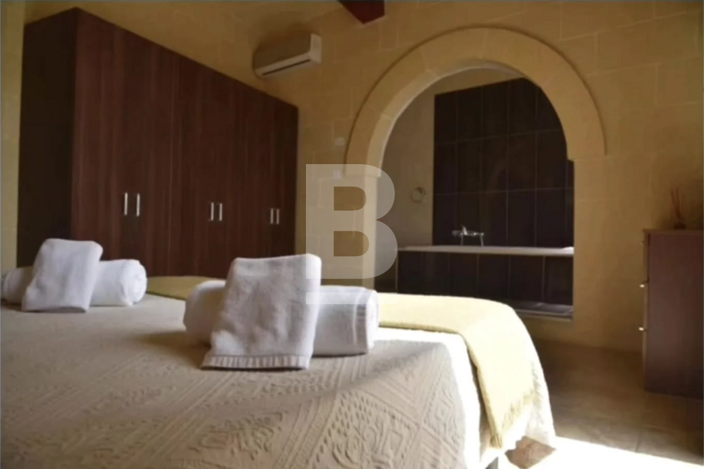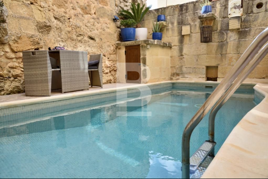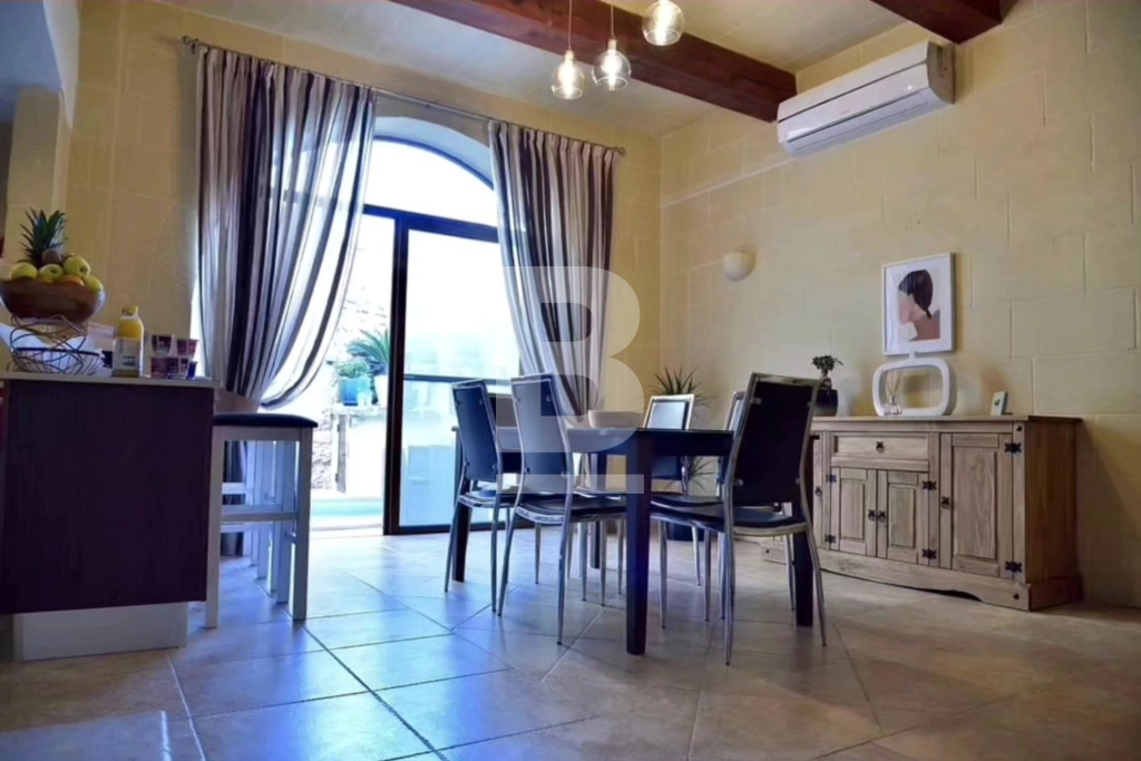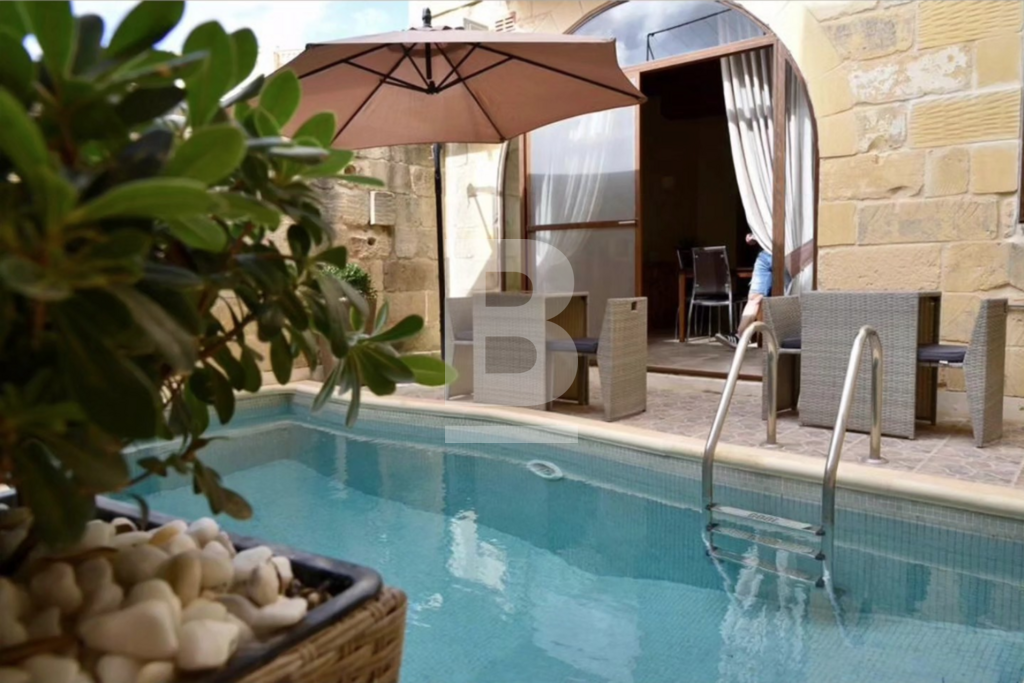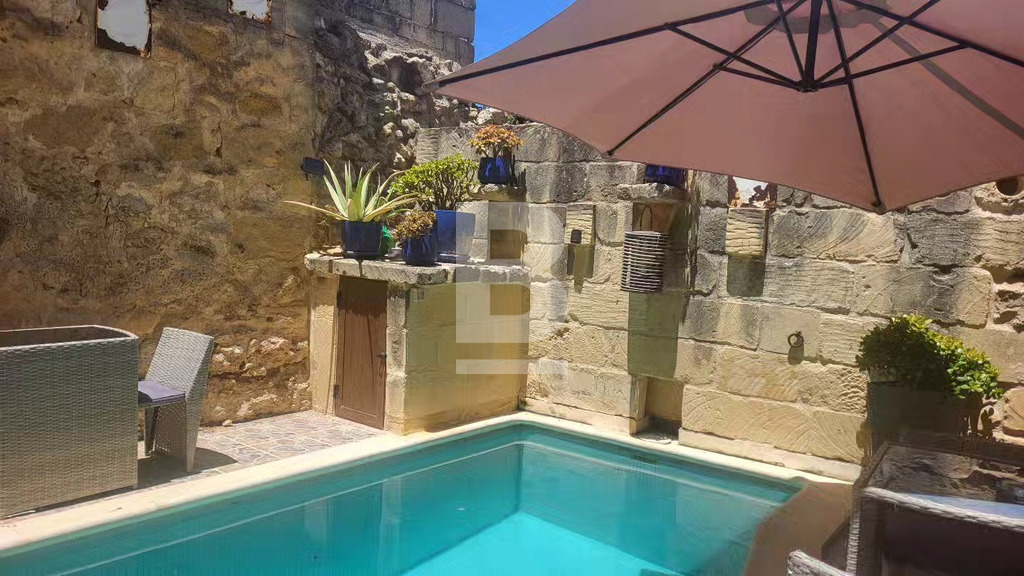 Situated in Xaghra, this well-appointed terraced house offers a comfortable and practical layout, fully air-conditioned throughout for year-round comfort. The main living area features a bright open-plan kitchen, living and dining space that flows directly onto the pool area, creating an ideal setting for both everyday living and entertaining. The residence comprises 3 generous double bedrooms, each with its own en-suite bathroom. Two bedrooms are located on the first floor, both opening onto private balconies, while the third occupies the second floor and also enjoys access to a balcony. A separate study adds further flexibility, whether for remote working or additional living space. At street level, the property benefits from an interconnected, spacious one-car garage, providing secure and convenient access directly into the home. Additional features include a front terrace and a solar water heater, enhancing both comfort and energy efficiency.