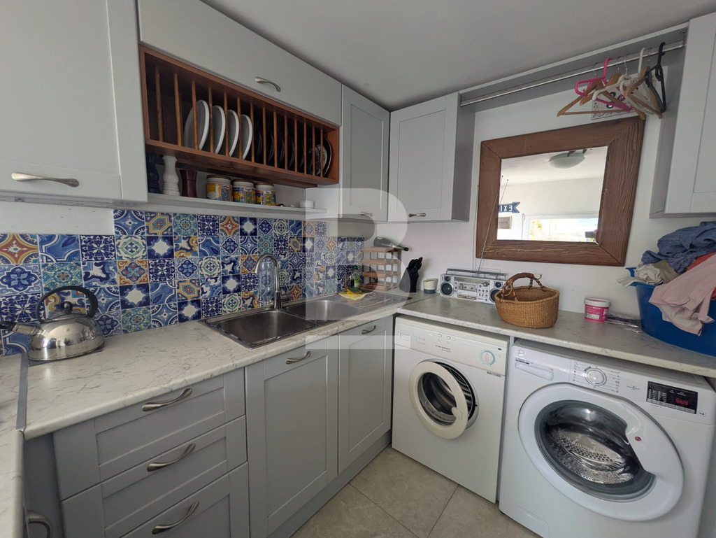 Upon entering, you are welcomed into a dining and kitchen area with direct access to an internal courtyard. This lovely yard brings in plenty of natural light and offers a peaceful outdoor setting with greenery, ideal for relaxing with a coffee at the table and chairs provided.