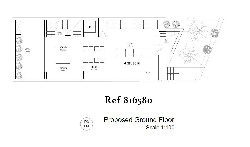 At basement level, the property features a spacious garage accommodating up to three cars. The ground floor comprises a bright open-plan kitchen, living, and dining area, a guest bathroom, and a side garden, allowing for excellent natural light.