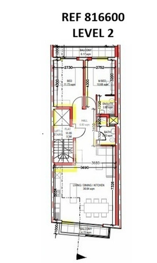 This 2nd floor apartment in Mellieha spans 100 sqm. The layout includes an entrance hall, kitchen/living/dining area, two bedrooms, one bathroom, an en-suite, and a front and back balcony. The property will be sold finished but without bathrooms and internal doors. Finishes starting in April and will be ready by October 2026.