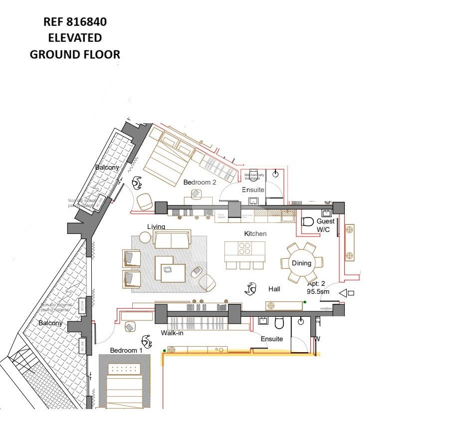 Maisonette located just off the seafront in Sliema, forming part of a corner layout with surrounding balconies. The property comprises an entrance hall leading to an open plan living, dining, and kitchen area, two bedrooms both with ensuite facilities, main bedroom also featuring a walk-in wardrobe, and a guest toilet. The layout provides a practical separation between living and sleeping areas, with a large terrace and balcony along the perimeter allowing for good natural light throughout.