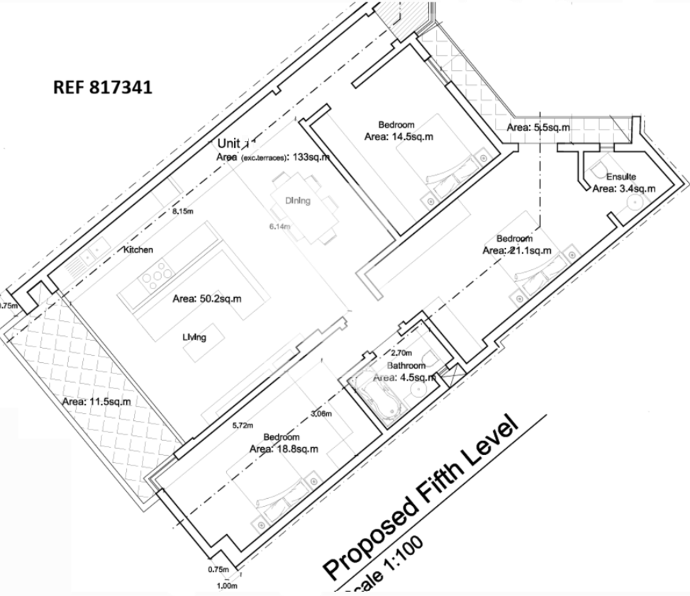 The layout includes an entrance hallway, a bright 50 sqm open-plan kitchen with island, dining area, and living room leading onto the front terrace. There are three larger-than-usual double bedrooms, with the main bedroom enjoying an ensuite shower room.